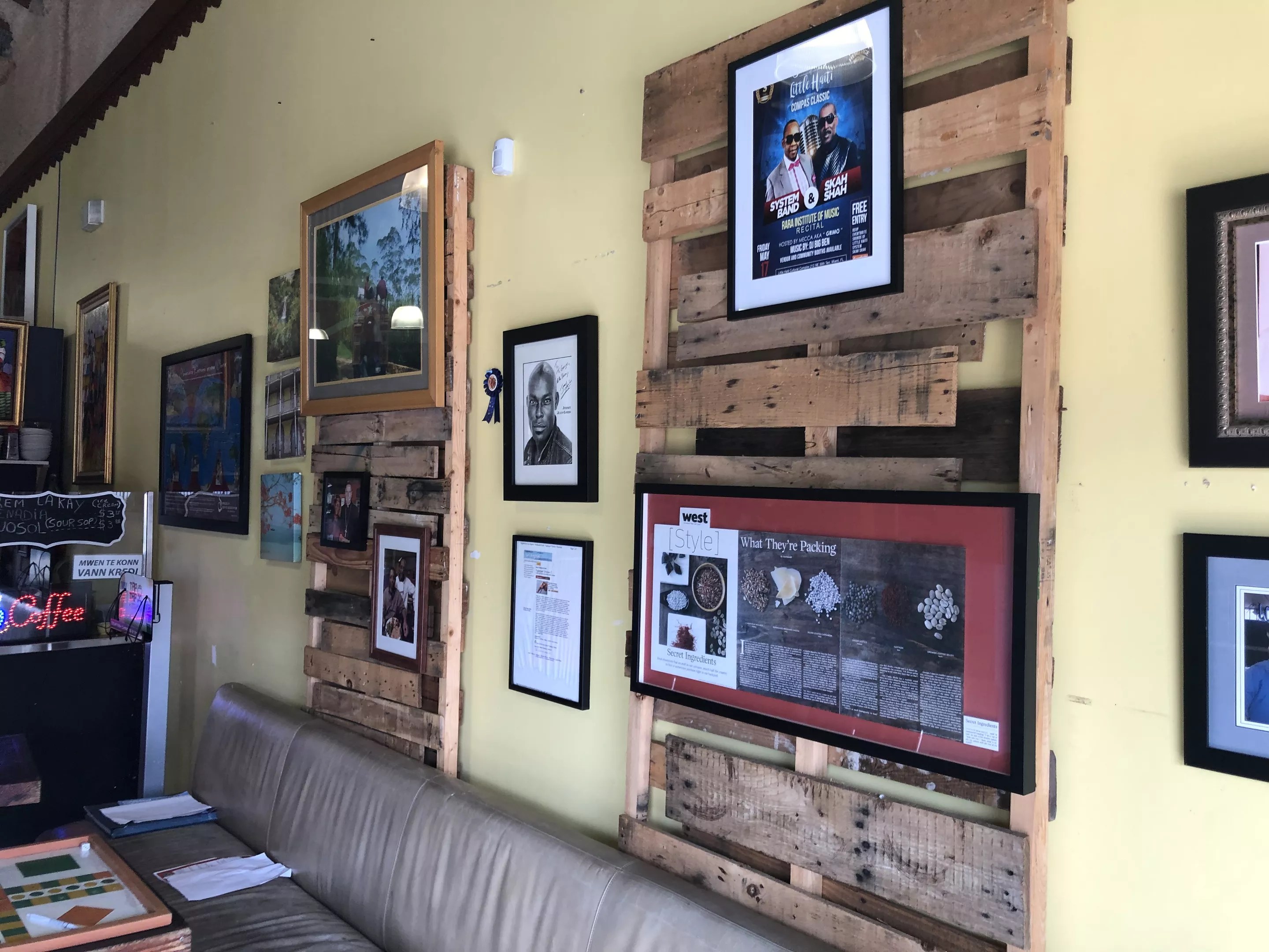 Past articles and pictures of famous guests hang on the wall of George Laguerre’s coffee shop, Tigeorges Kafe, in Little Haiti.