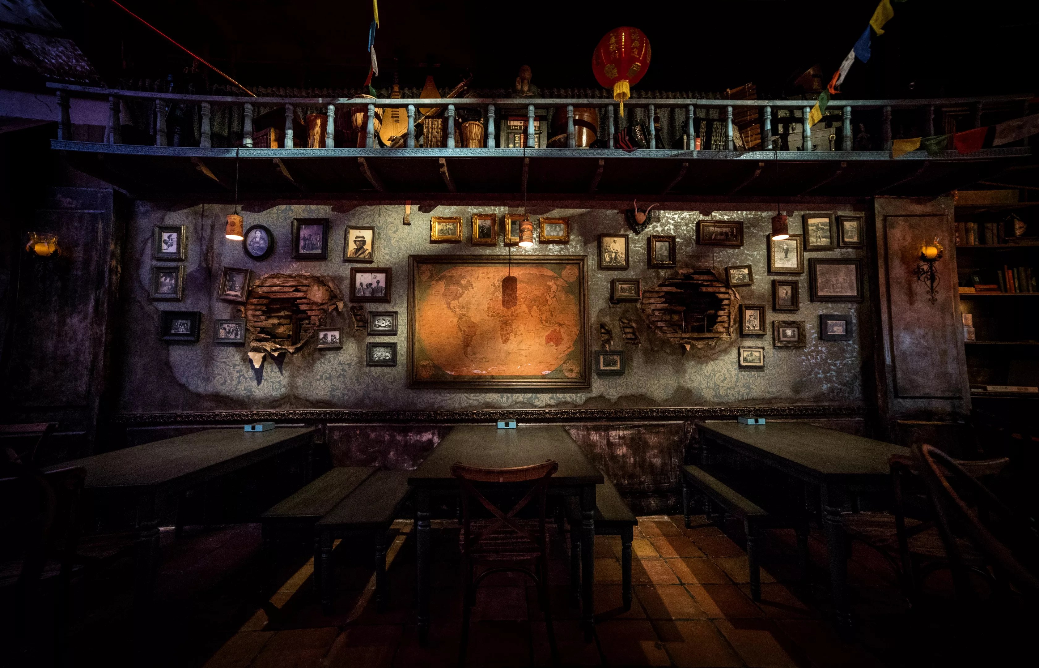 The space, filled with jungle relics and tropical accents, is themed after a fictional abandoned mansion where patrons play the part of travelers who meet in secret to exchange tales of pirates, safaris, and treasure hunting.
