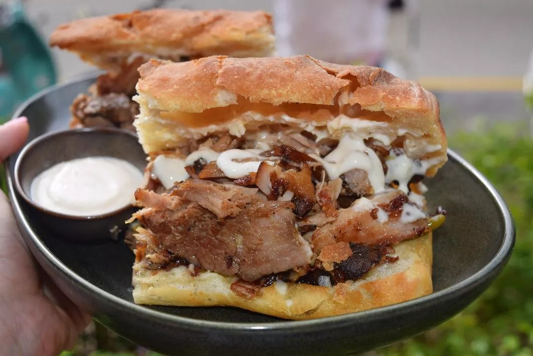 topped with slow-braised short rib, Vermont cheddar, mushroom gravy, and pickled jalapeños ($12); jalapeño, bacon, and cheddar corn dogs ($9); and a roast pulled-pork sandwich with aged provolone, horseradish sauce, and hot peppers served on a toasted Sullivan Street Bakery doppio ($14).