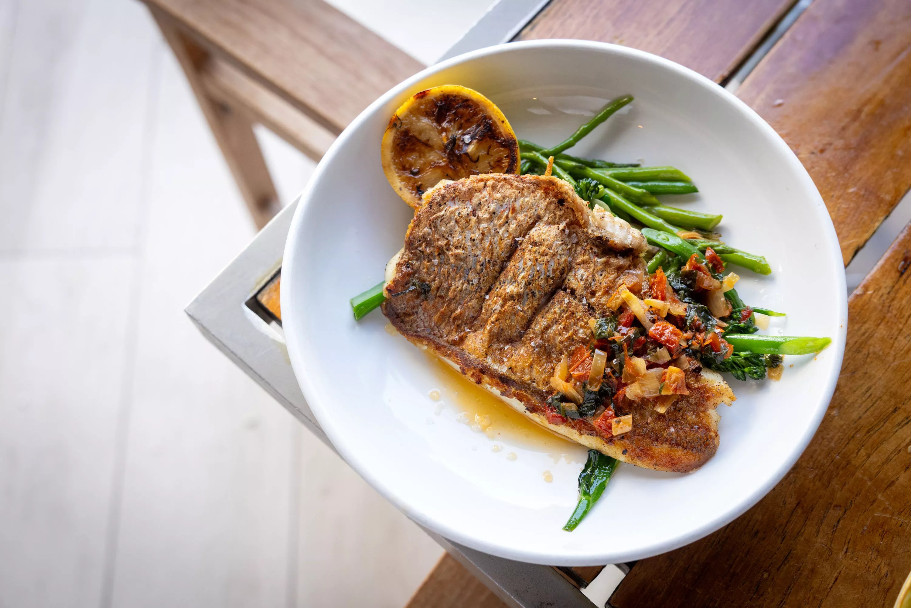 Then we moved to dinner entrees. The real MVP was the 12-ounce grass-fed Uruguayan ribeye steak from their dinner menu. Miami Spice has a reputation for somewhat skimpy portions, especially when it comes to meat. Not here. This was a proper 12-ounce steak, perfectly cooked, served with mini potatoes, onion, tomato Provençal, and garlic butter. The pan-roasted red snapper with broccolini and haricot vert brought Mediterranean vibes to the table.