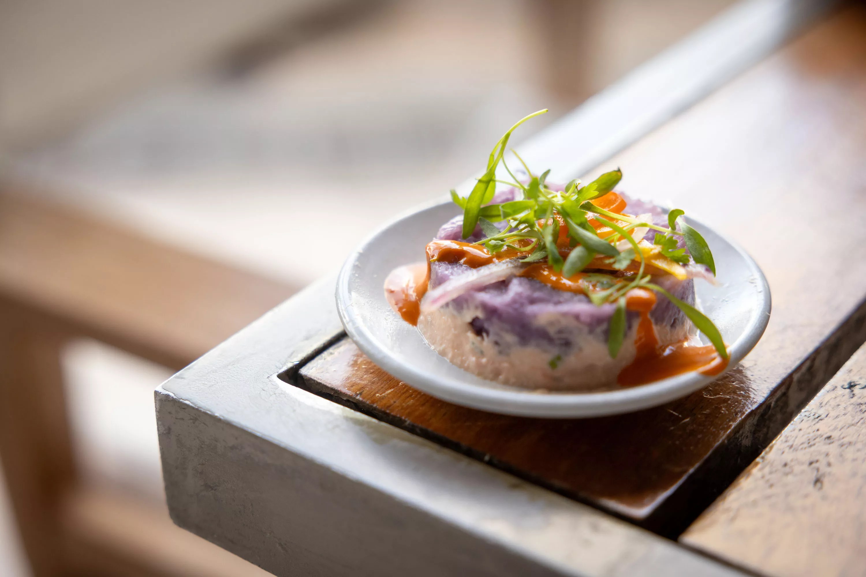 The arugula and fennel salad with grapes, blue cheese, almonds, and balsamic vinaigrette hits all the summer notes, being refreshing without being boring. Other lunch appetizers guests can expect include the salmon causita layered with purple potatoes, avocado, and ají panka aioli.