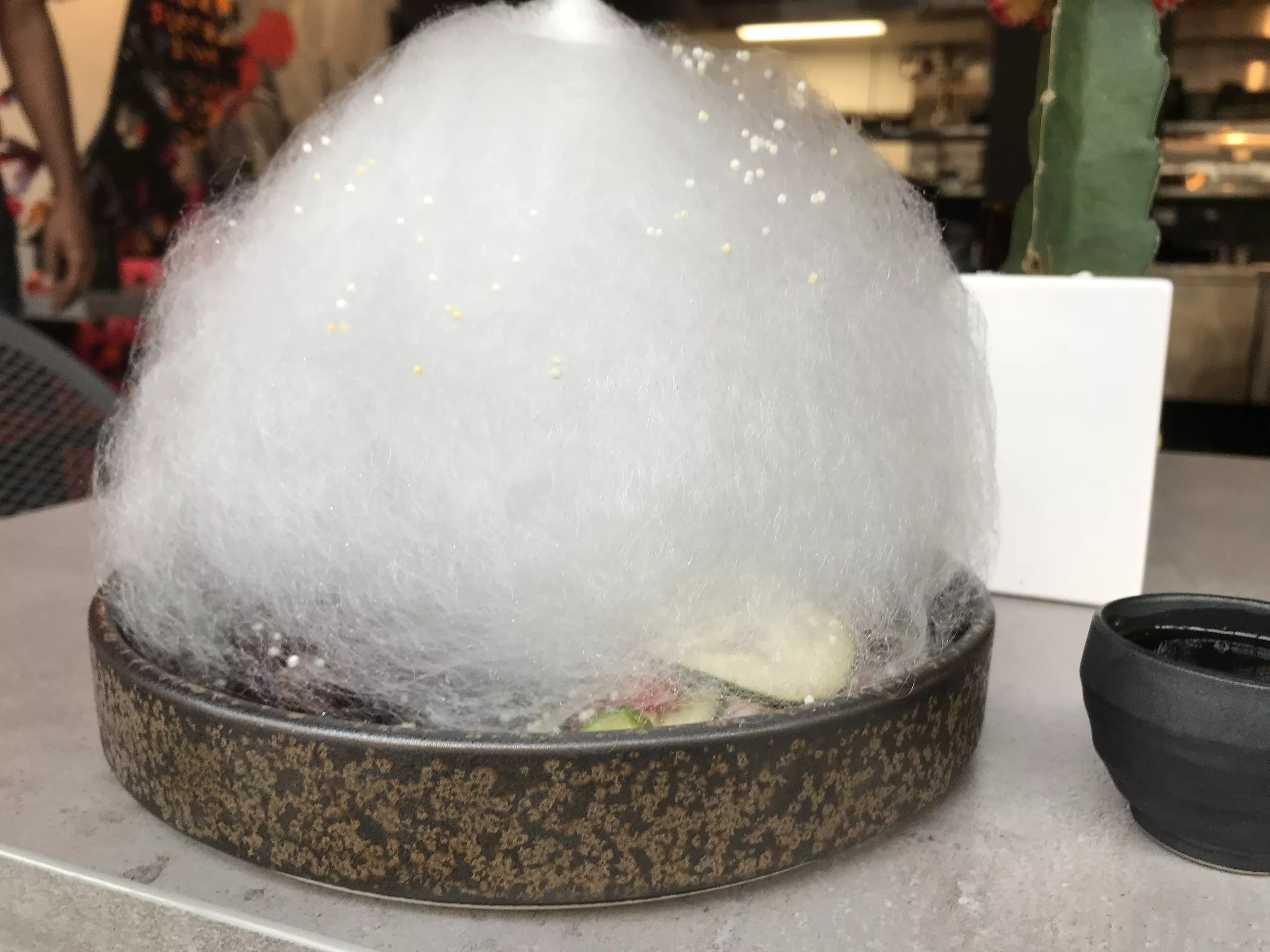 Pork belly with a cotton-candy topper.