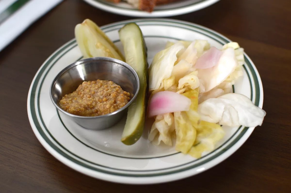 Pickle plate with house mustard.