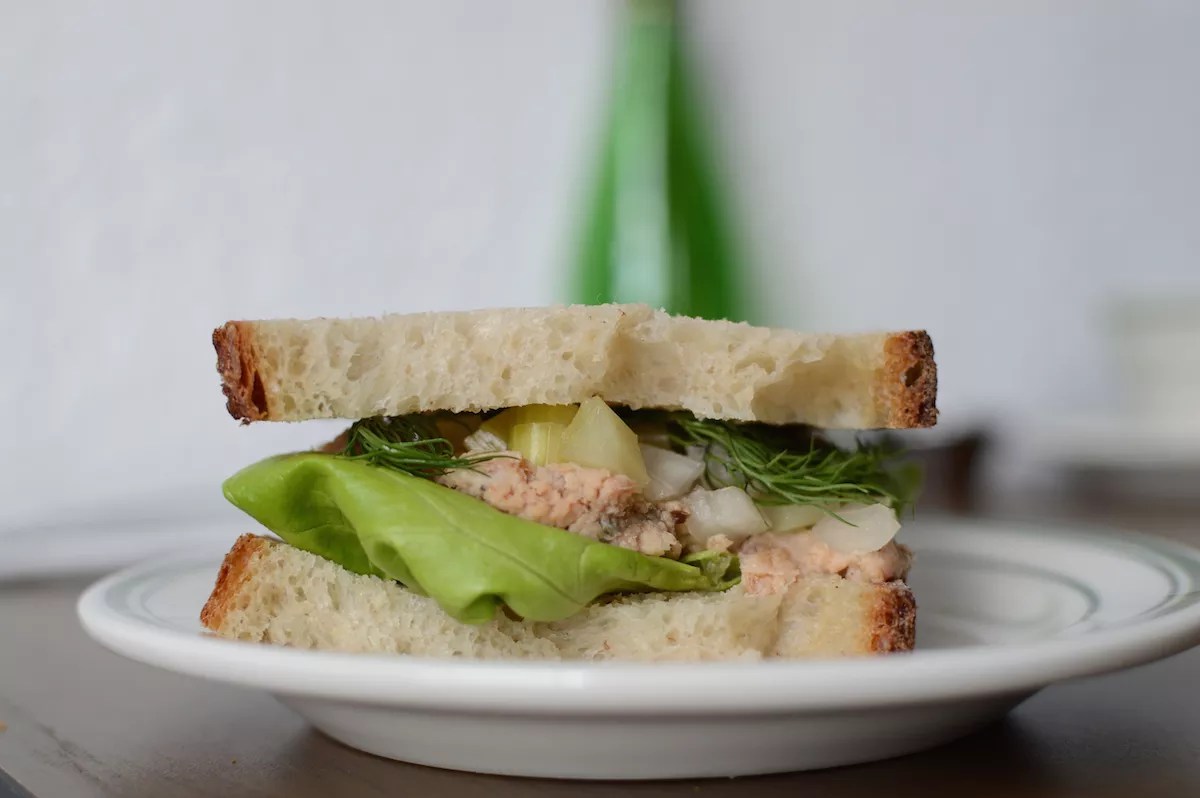 The result is a savory, salty-as-hell fish salad in a sandwich ($13) using slices of Stern’s bread and accented with diced white onions, a lime-green fold of lettuce, and a few piney frills of fresh dill.