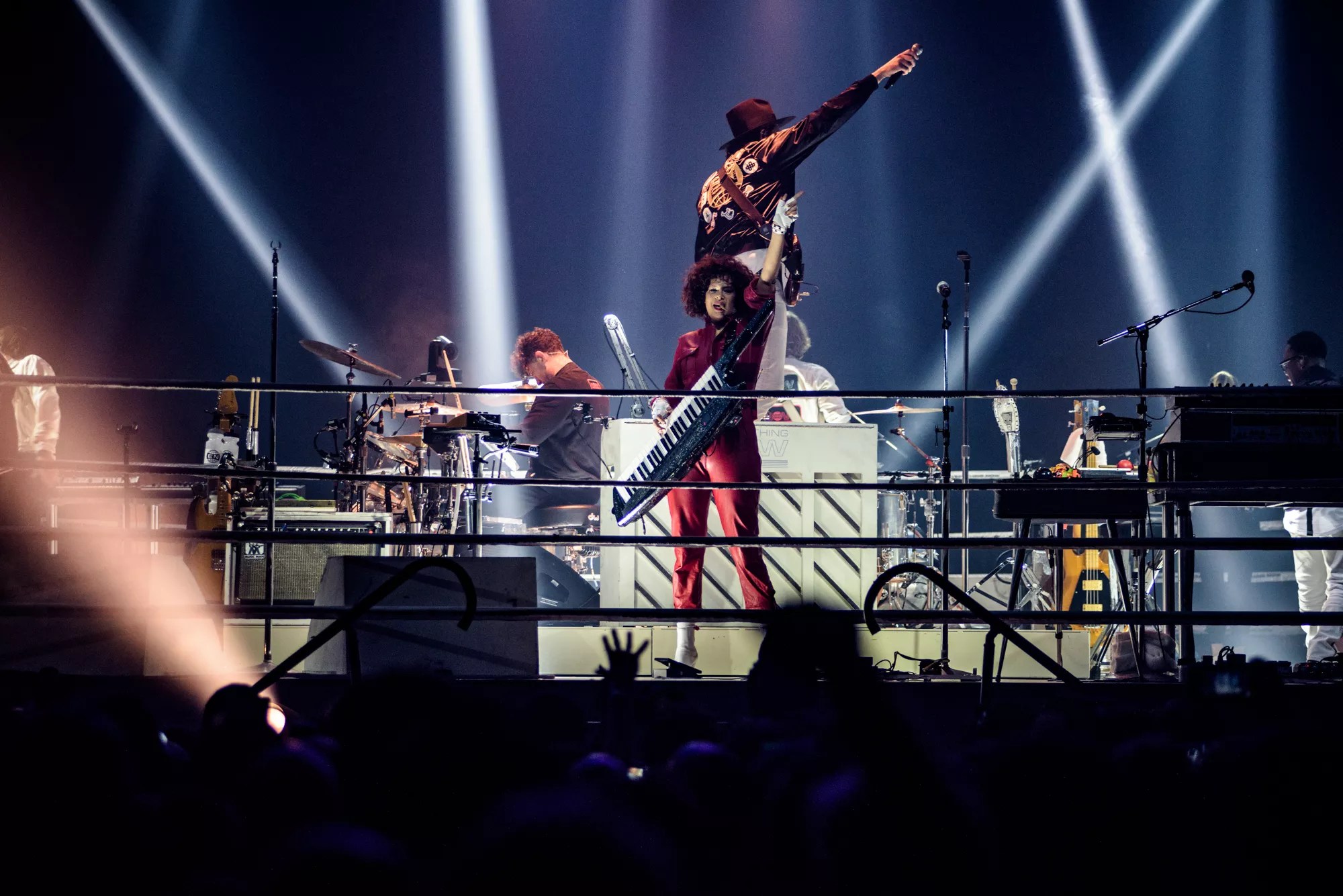 But for as intimate as the show felt, the band still put on a spectacle. Accompanied by visuals from the fictional Everything Now Corp, sandwiched between two disco balls and enveloped in technicolor lights, Arcade Fire gave the crowd a set that equally paid tribute to the band’s past while embracing its present, playing roughly two-thirds of Everything Now alongside cuts from across their discography.