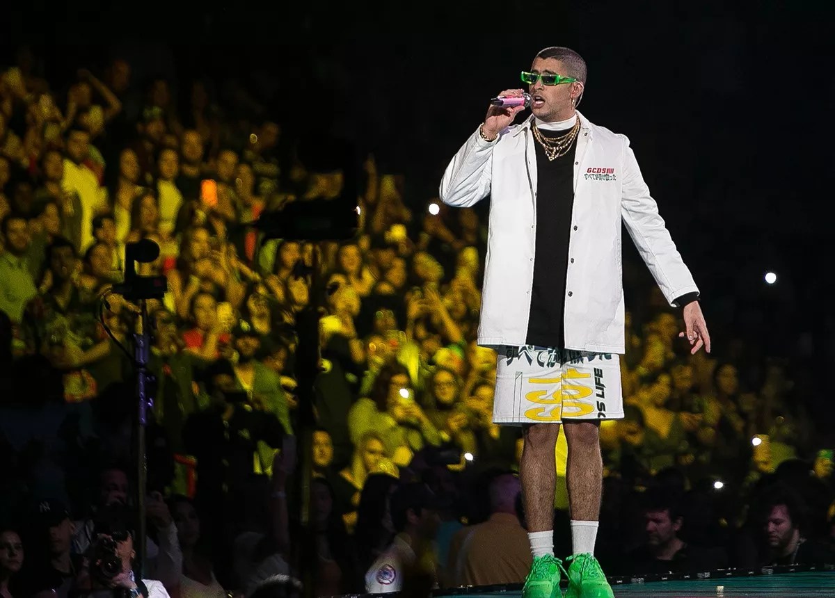 The arena lights dimmed to blue and the crowd began to chant “Bad Bunny.” Their lord and savior appeared from stage left in a godly, all-white matching jacket and shorts set with a black T-shirt. His neon-green shoes and sunglasses glowed in the lights as he paced the cross-shaped stage, excited to deliver the sermon of the night. In Bad Bunny we trust.