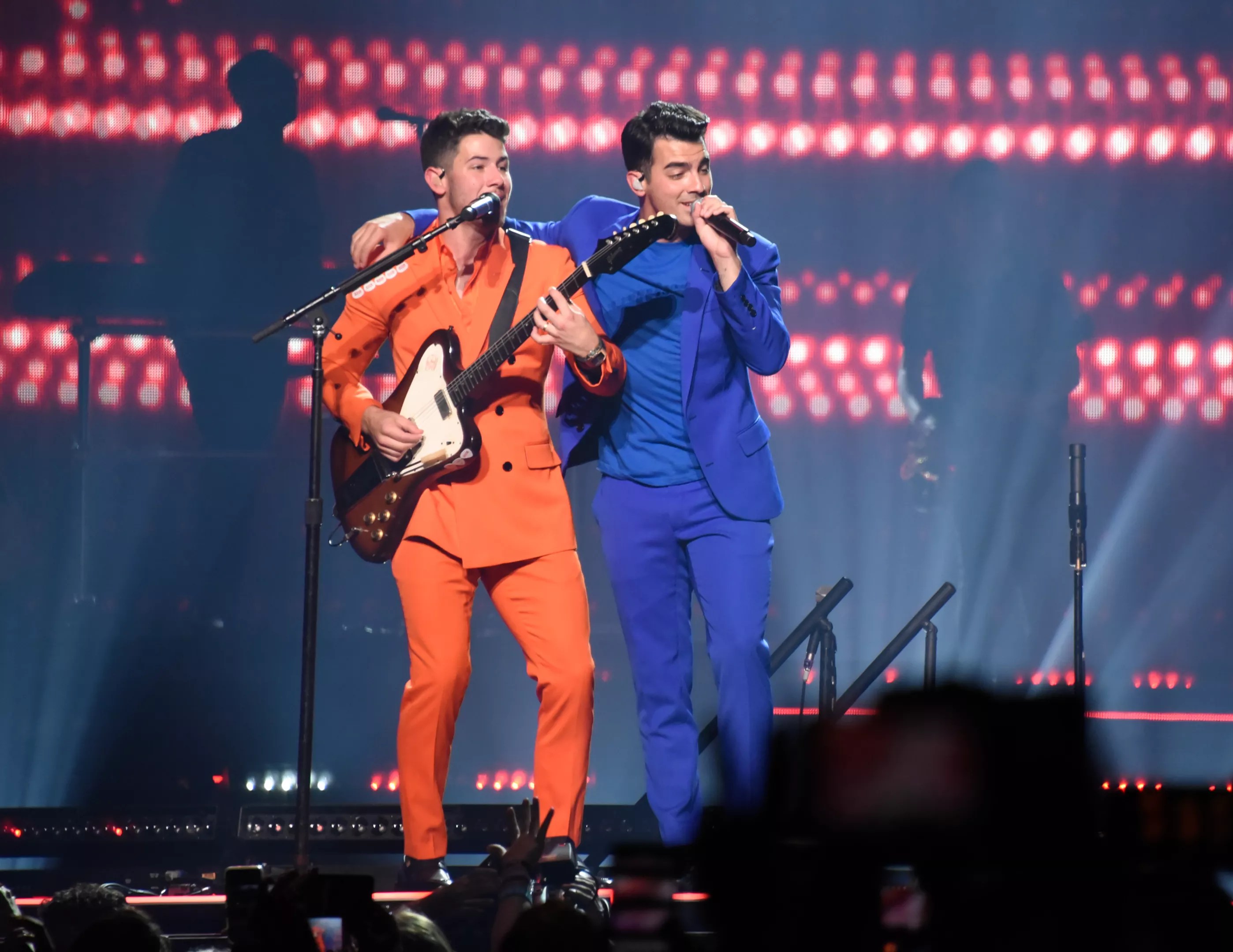 The Jonases made the most of the arena by decorating the venue with colorful confetti, fireworks, and their own jewel-toned suits – Nick in orange, Kevin in purple, and Joe in blue – before switching to striped black-and-white outfits. The show was also accompanied by visuals of them and of actors portraying younger versions of the trio, honoring their journey as brothers.