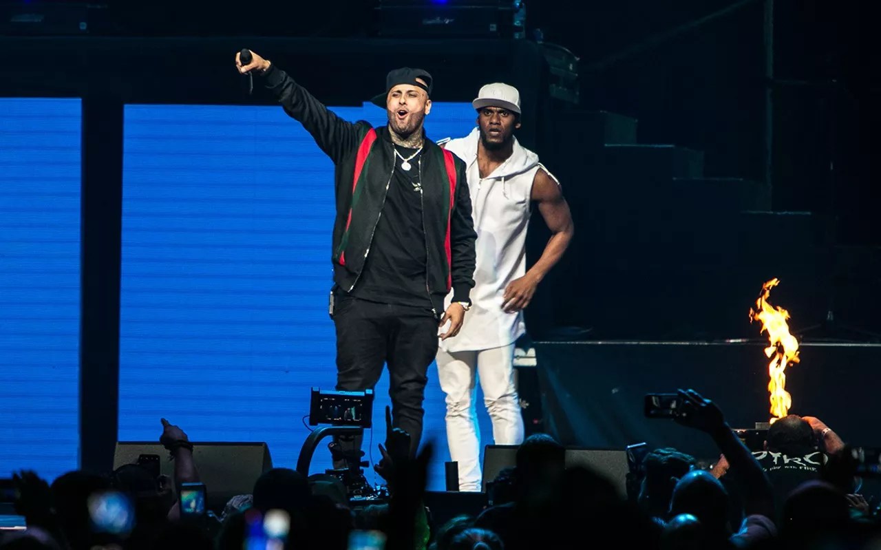 Headliner Nicky Jam’s set began with clips of him winning awards over the past couple of years – an apt intro to a tour he’s chosen to call El Ganador. The montage quickly alluded to Jam’s struggles as a troubled youth growing up in Puerto Rico. The videos might have been preview clips of a 13-episode scripted bio-series based on his life and starring the singer that is set to premiere on Netflix and Telemundo this summer.