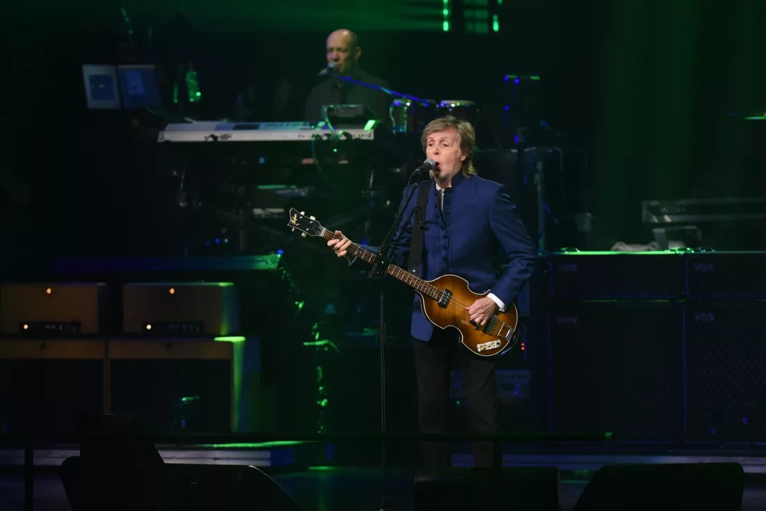 His eyebrows rose, and he kicked off a roughly two-and-a-half-hour set, starting with “Can’t Buy Me Love” while strumming his signature Hofner 500/1 violin bass abetted by Vox amplifiers stacked like bricks.