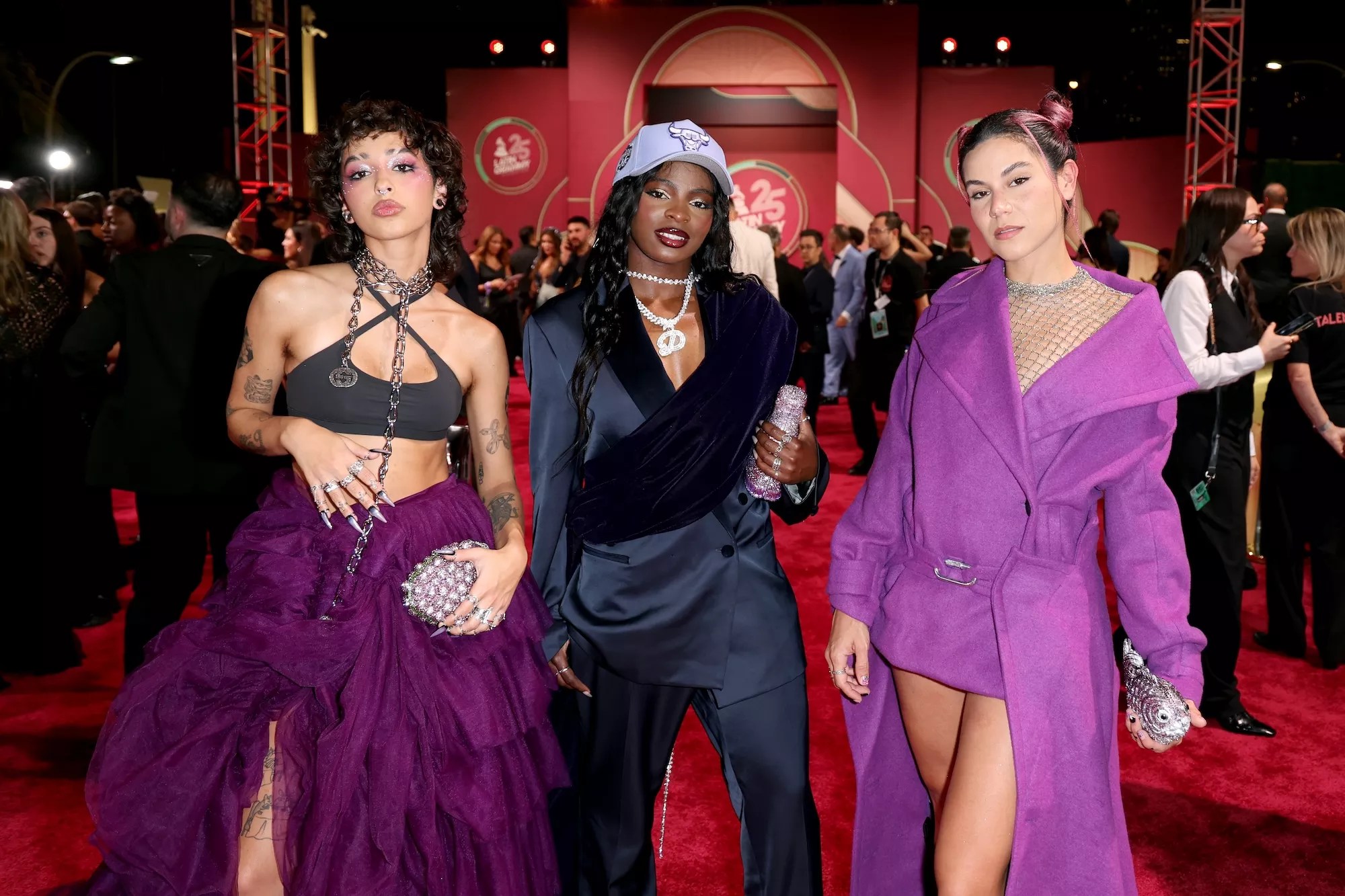 Ceci León, Vedala Vilmond, and Aldana Aguirre of Darumas on the red carpet at the Latin Grammys in Miami