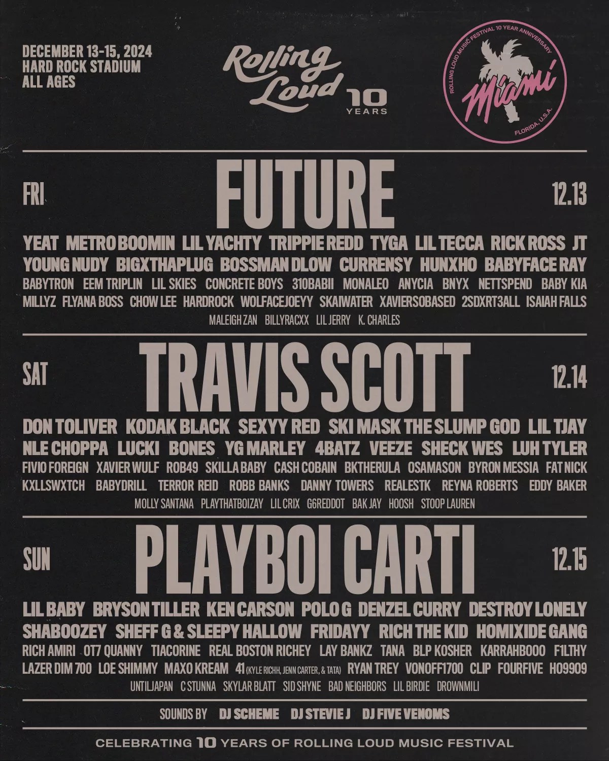 Homegrown hip-hop music festival Rolling Loud has announced the lineup for its 2024 edition, which also marks its tenth anniversary. Returning to Hard Rock Stadium December 13-15, this year’s headliners include Travis Scott, Playboi Carti, and Future.