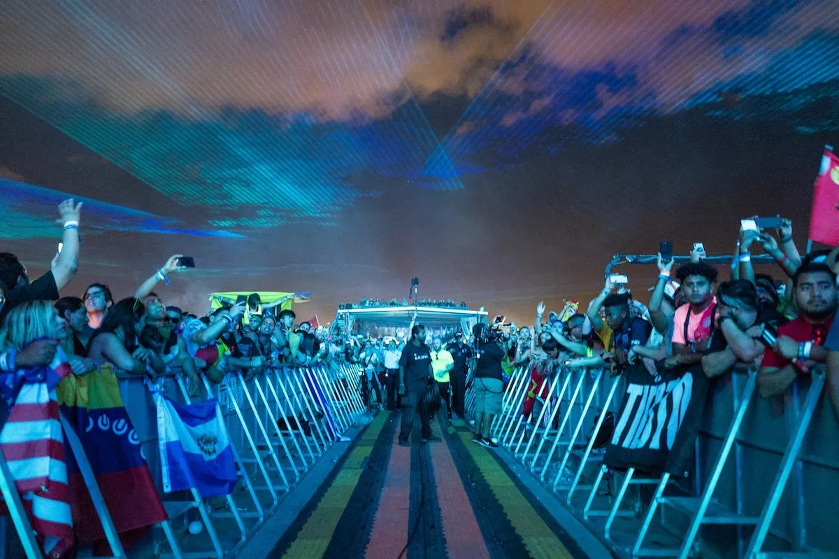 But far from being comforting, the choppers only magnify the dystopian nightmare unfolding. Rather than the smooth exit promised by festival organizers, departing Virginia Key feels more like a gauntlet. For the masses, there are two options to escape the island: wait for hours as people push and shove to secure a spot aboard one of the festival shuttles – all while trying not to hit one’s face or get one’s foot run over by the arriving buses – or make the three-plus-mile trek across the Rickenbacker Causeway on foot. As thousands opt for the latter, the lanes of the causeway quickly become commandeered by the horde, which somehow avoids getting struck by cars zooming past. Not long after Marshmello’s “Happier” has wrapped up, the booming voice of Ultra announcer Damian Pinto echoes across the island: “Make some noise, Miami!” Several walkers begin to scream.