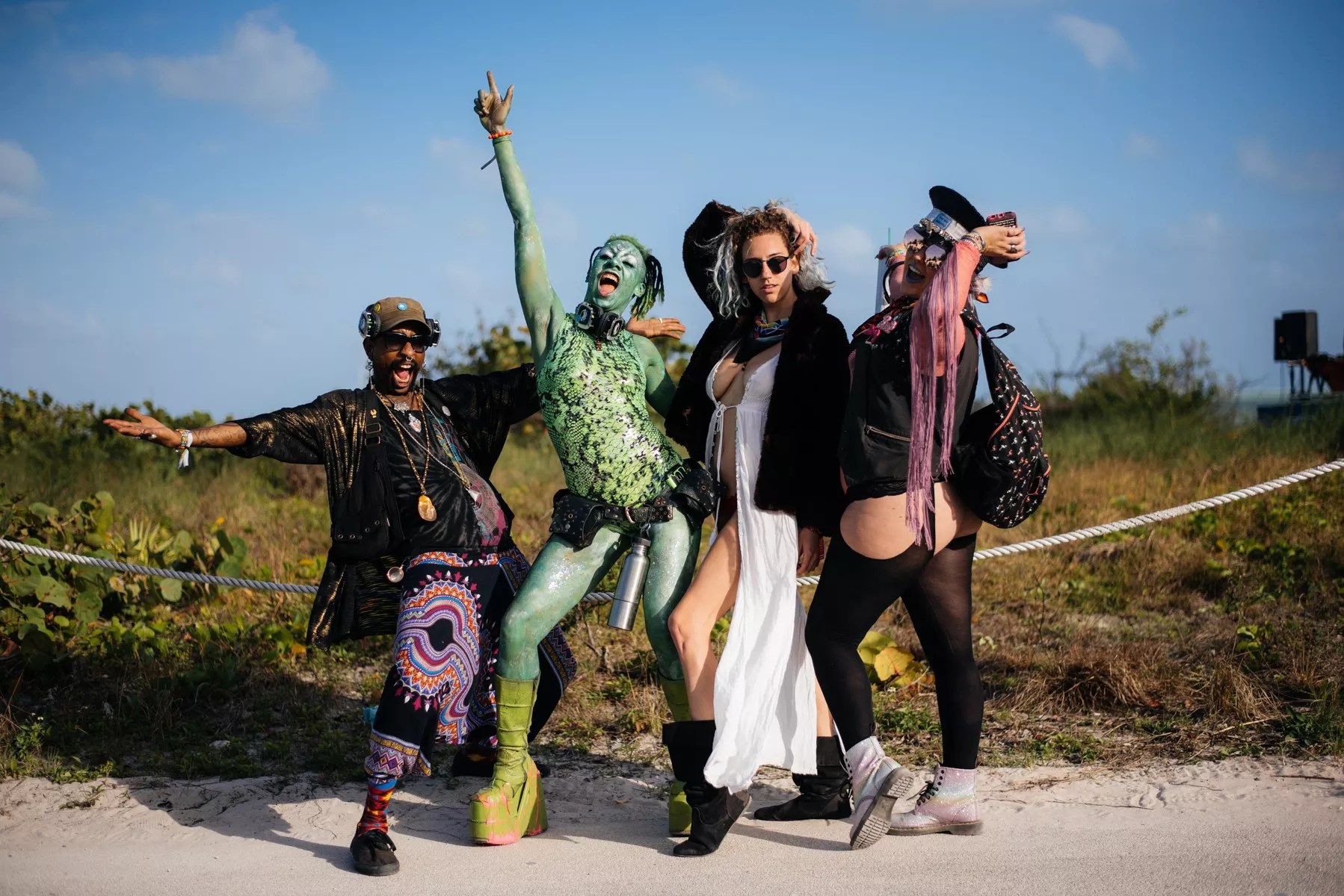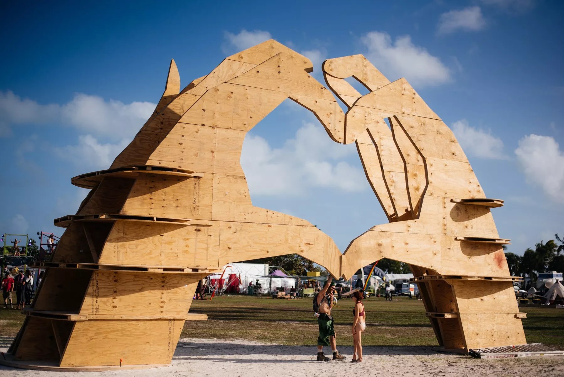 The group hugs are the first clue there are definitely some genuine connections – whether artificially enhanced by touchy love drugs. Everywhere you turned, groups of people were hugging and lying in stoned cuddle puddles under fire-lit geodesic domes on the sands of Virginia Key Beach Park. Couples made out on the grass next to fire installations. Others raved beneath a jungle gym crafted for an adult dance party. Attendees dressed as those they wish to be in daily life – whether in animal costumes, rave-wear, or partially nude – creating a world where burning art installations takes precedence over the outside world.