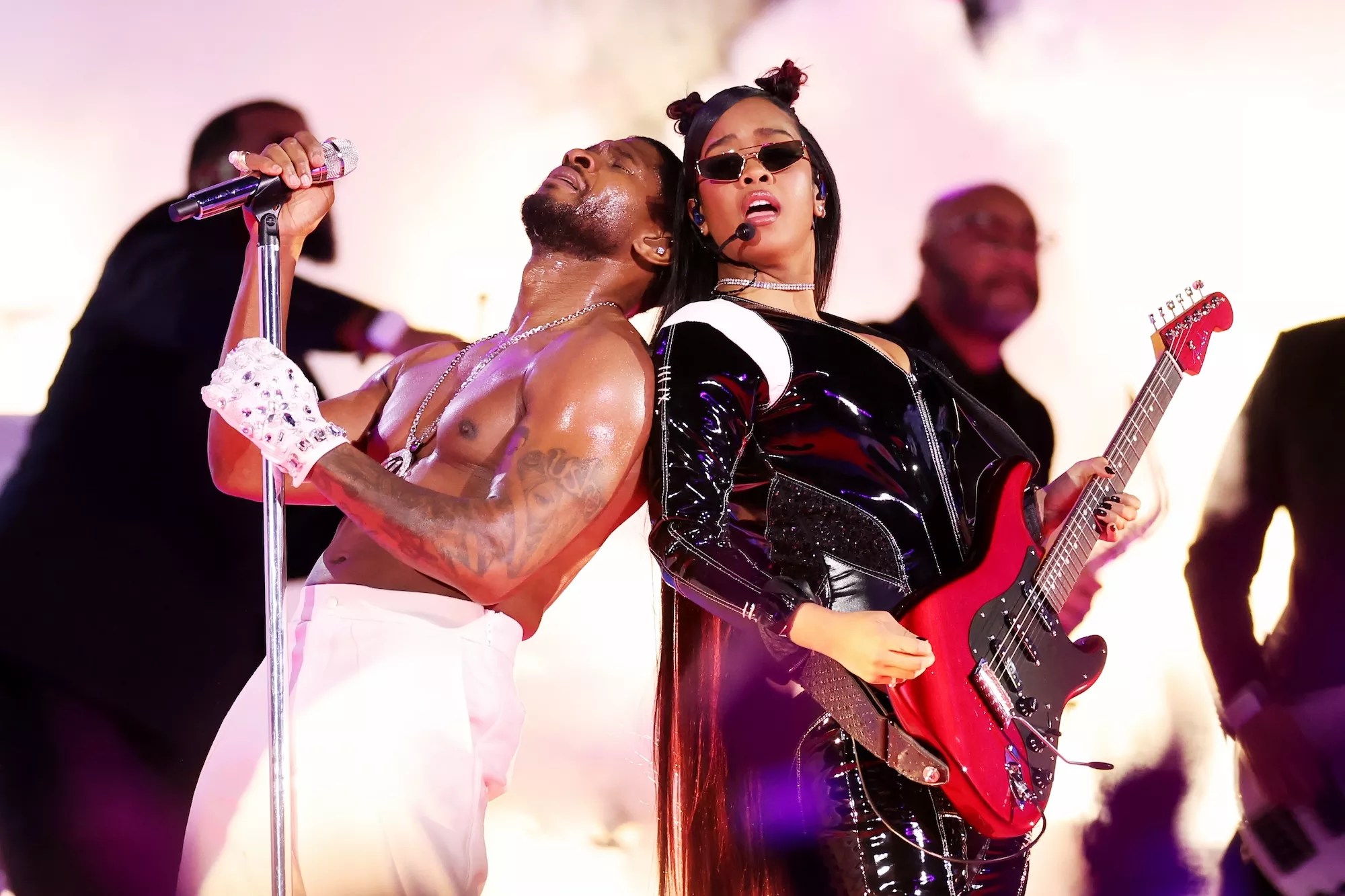 Usher and H.E.R. perform onstage during the Apple Music Super Bowl LVIII Halftime Show.