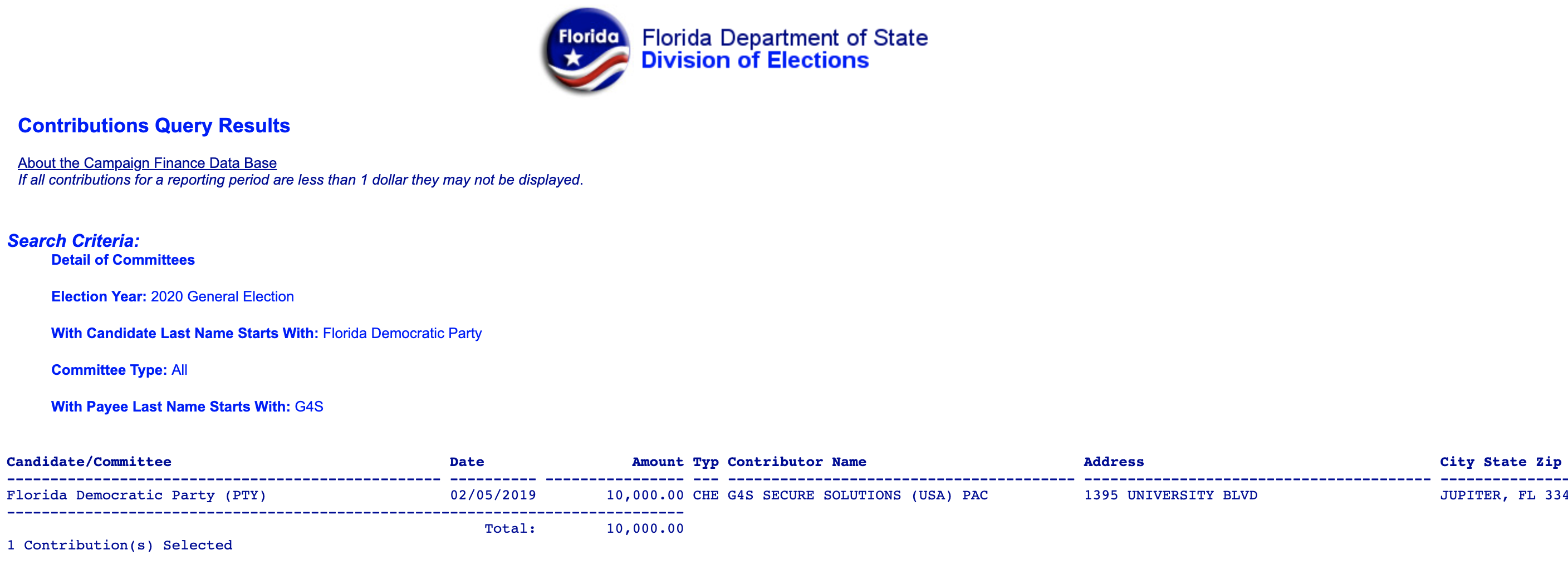 In February, the Florida Democratic Party accepted a $10,000 donation from G4S Secure Solutions, a private firm that runs immigrant-detention facilities in other countries and transports American inmates between prison facilities.