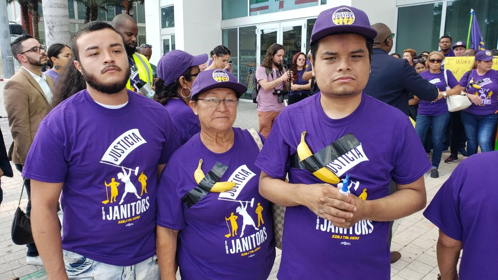 They’re calling it the “plátanito protest.” Janitors with bananas taped to purple union shirts are marching in the streets of downtown Miami this afternoon to protest low wages and working conditions in an industry rife with abuse and intimidation.