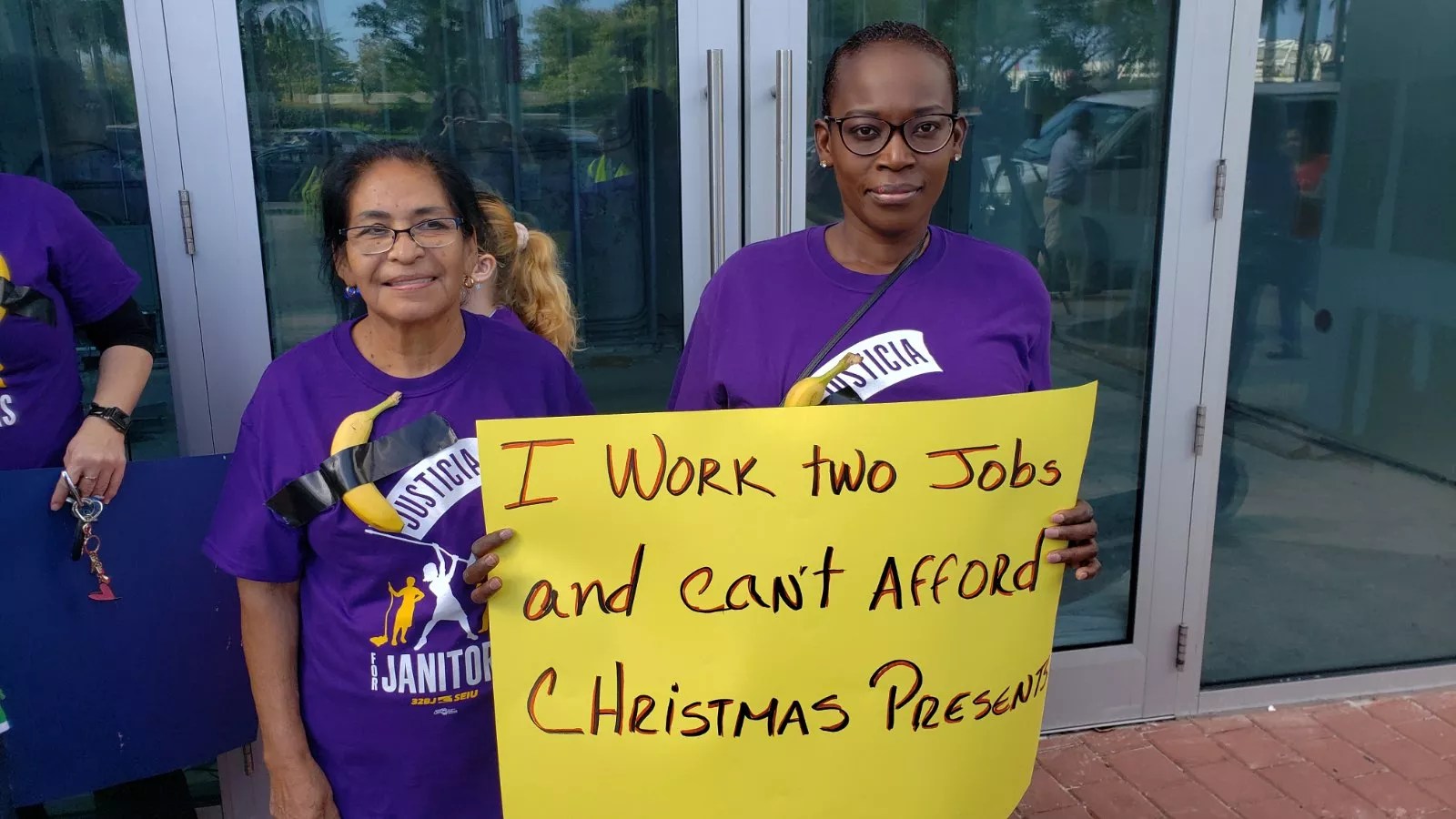 “How much are we worth? A banana is worth more than us, apparently,” says Cardenas, who earns $8.46 an hour cleaning a luxury office building in downtown Miami. “Our work is something people don’t value; they look at us like we’re nothing. But it’s a job with dignity, and it’s tough work. We deserve better payment.”