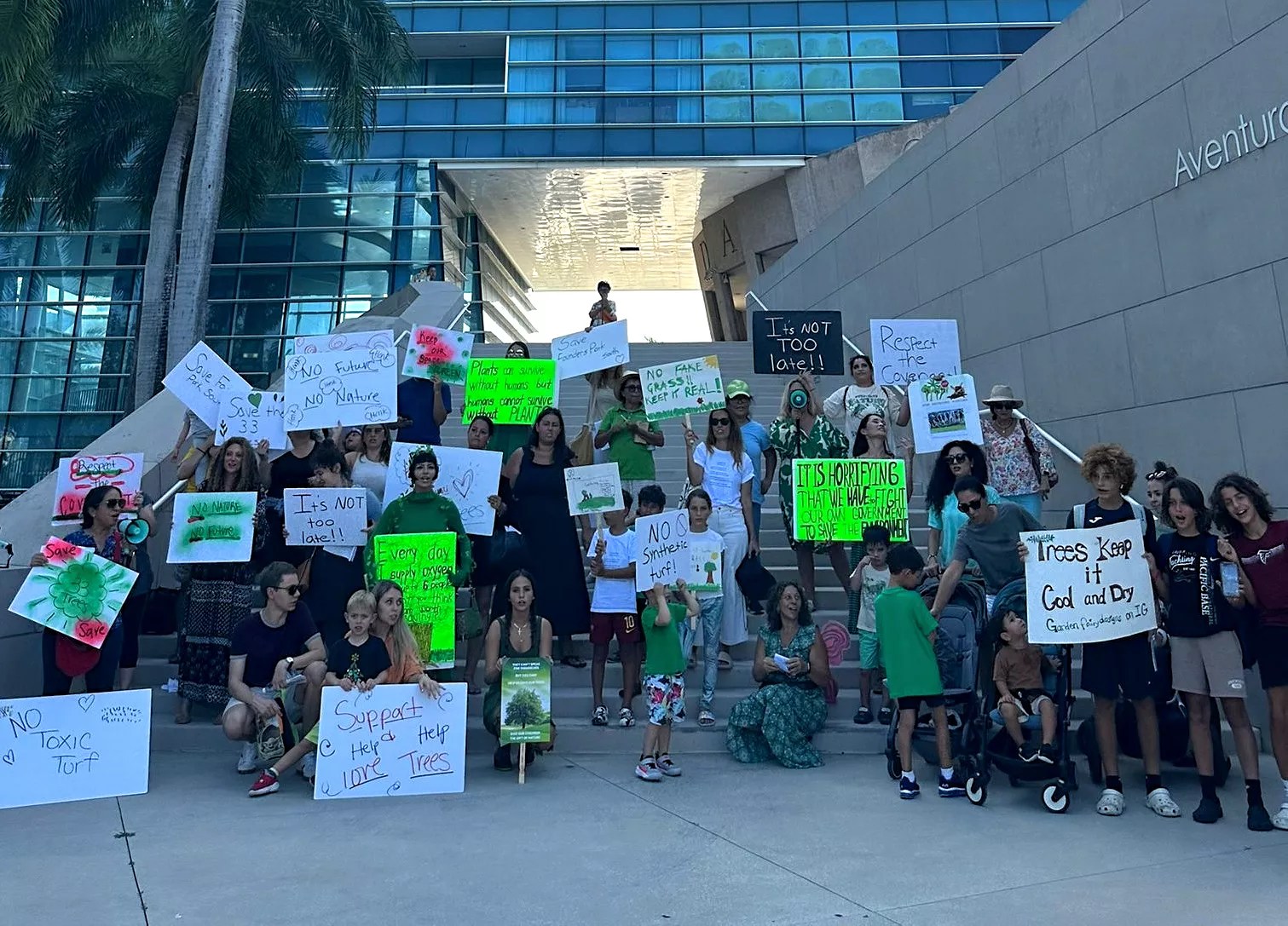 Despite a heat advisory that lasted through late afternoon, several generations of Aventura residents – from toddlers in strollers to seniors – gathered on the steps outside of city hall around 5 p.m. Tuesday to speak out against the project. Protesters wore various shades of green, including a few people dressed as trees to represent the dozens of trees slated for removal to make way for the sports complex.
