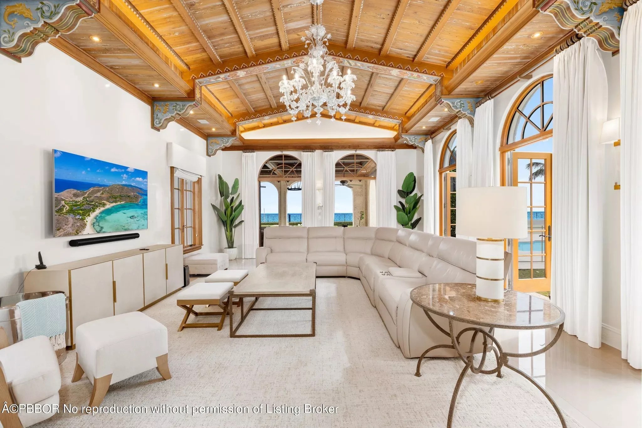 This living area boasts a vaulted wood ceiling, chandelier, and panoramic views of the ocean.