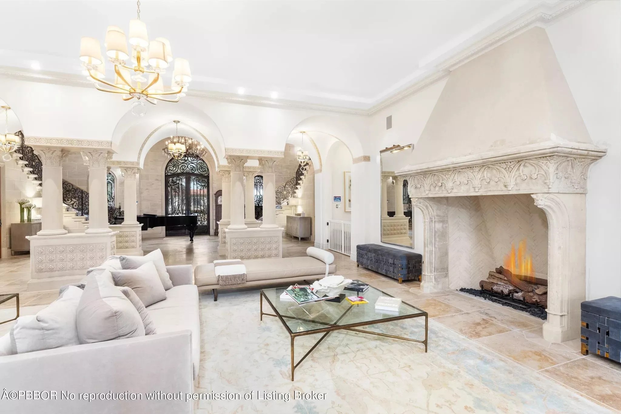 A spacious, elegant living area complete with a grand fireplace and arches leading to the foyer