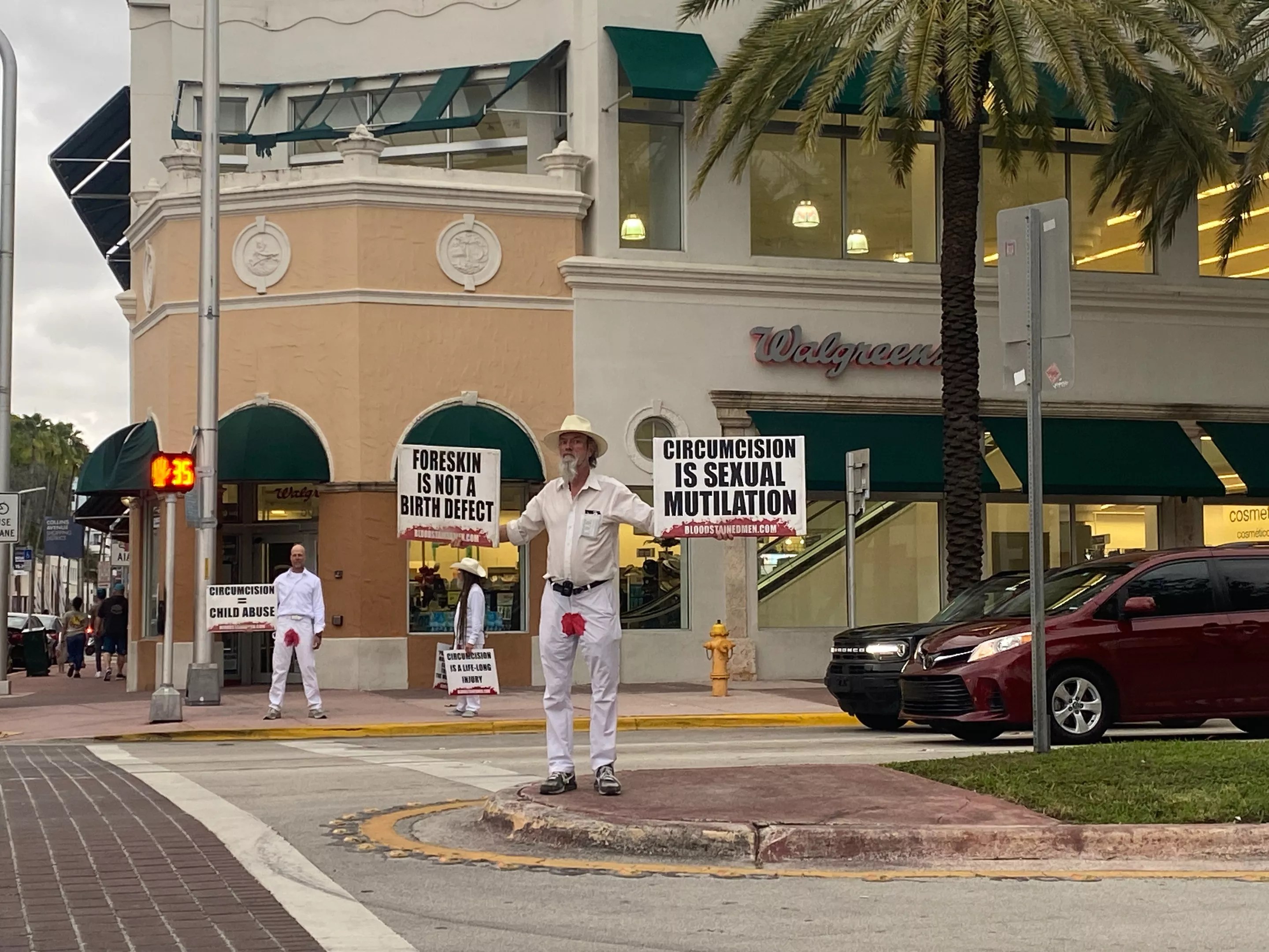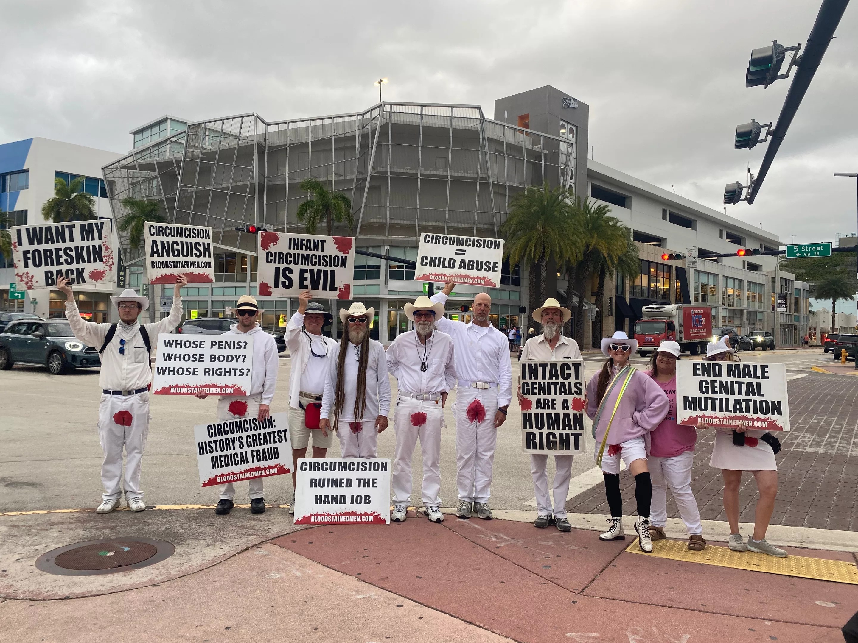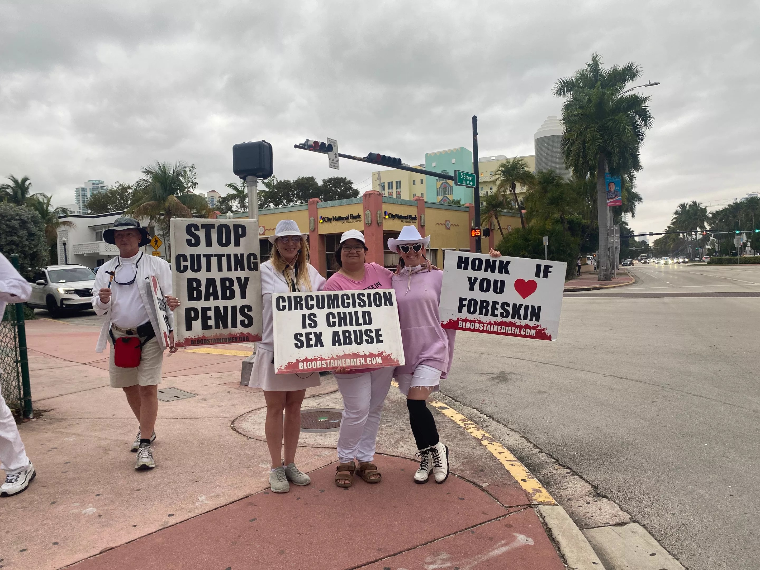 Bloodstained Men have organized 26 protests over two weeks across Florida. Earlier on Friday, they gathered at North Kendall Drive and 137th Avenue in Kendall and at SW Eighth Street and 107th Avenue near Florida International University’s Modesto Maidique campus. A day prior, they were in Key West and Marathon. Over the weekend, they’d move on to Pembroke Pines, Pompano Beach, Boynton Beach, and Jupiter, then on to Vero Beach, West Melbourne, Port Orange, Orange City, and Orlando. A billboard they purchased on northbound I-75 near Ocala reads, “Circumcision Cruel & Harmful.”