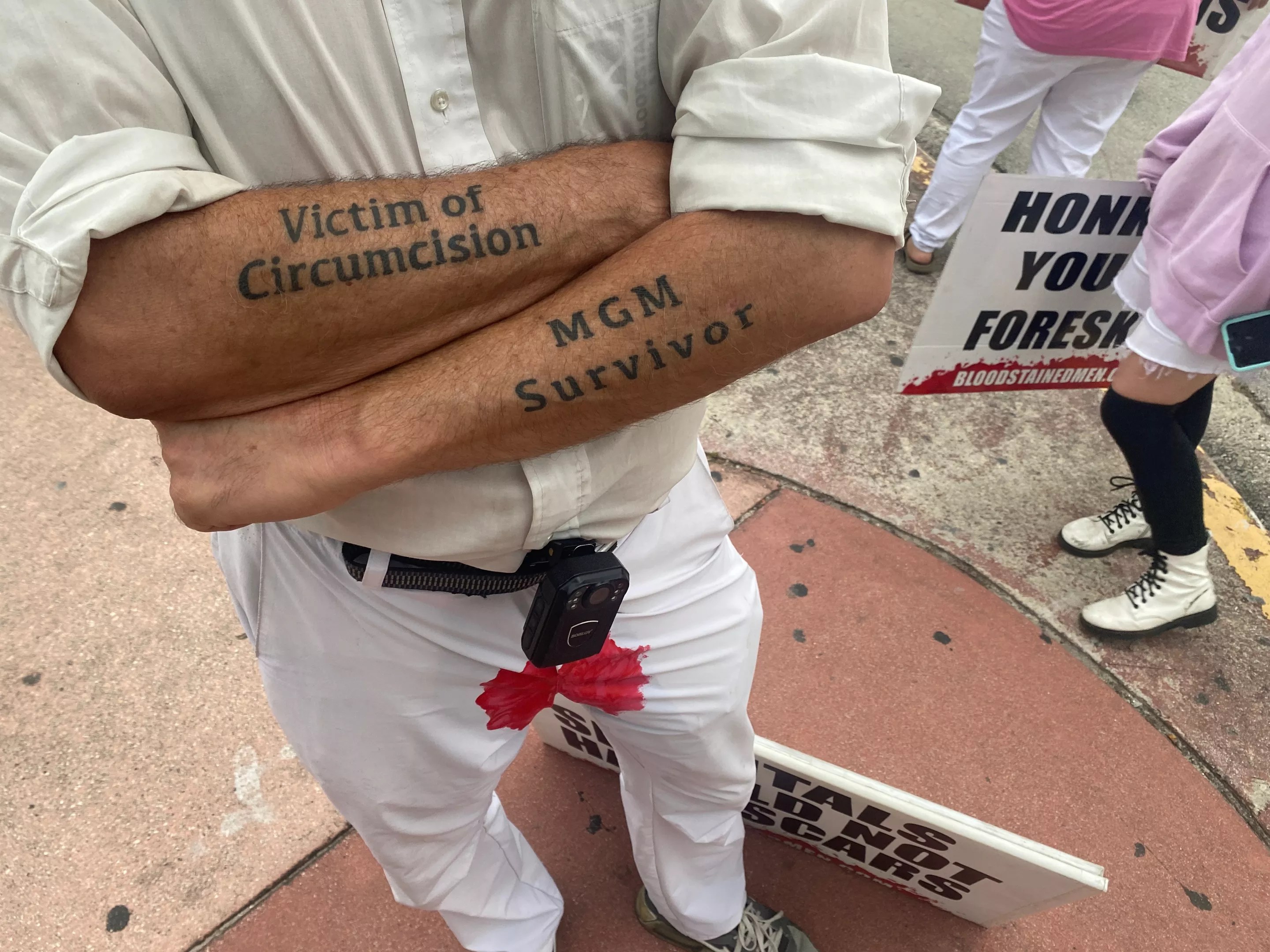 “I have had pain in my penis my whole life that I thought was normal. I found out it was called amputation neuromas from when the nerves were severed,” protester Daniel Bryce says. “I was waiting until my parents passed away before I did my research into it because I was afraid I would be livid with them – and I am livid with them.”