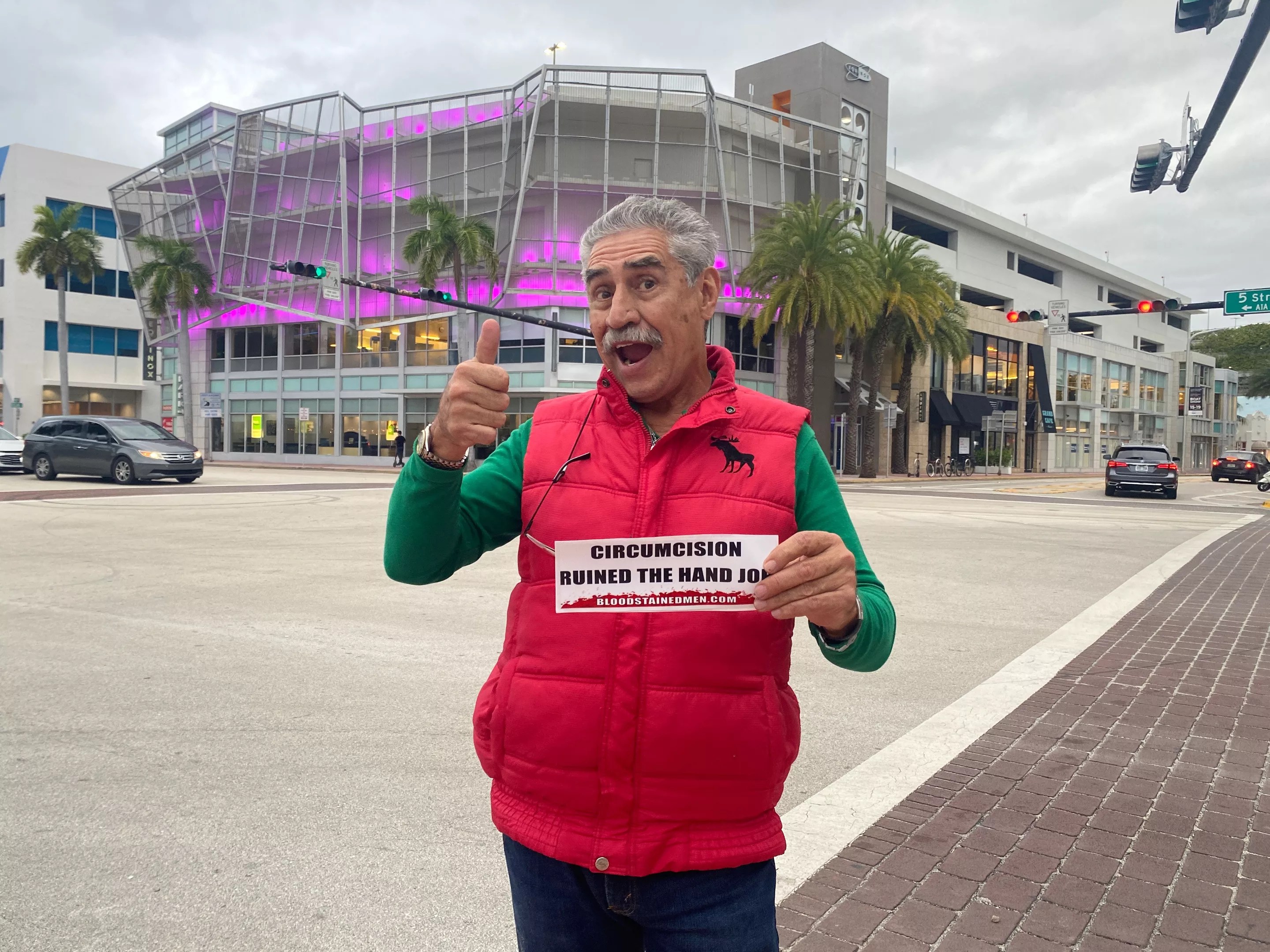 Atkinson is president of Bloodstained Men, a nonprofit that seeks to give “victims of genital cutting a voice” and to educate Americans about the harms of infant circumcision and the anatomical importance of the foreskin. On this last Friday afternoon in January, he’s one of seven circumcised men dressed in the group’s signature all-white getup with identical trouser stains commanding the intersection at Collins Avenue and Fifth Street in Miami Beach. For more than an hour, they hold up signs and banners and distribute pamphlets and bumper stickers with slogans like “Circumcision ruined the hand job.” Most passersby avert their eyes to avoid falling prey to a spiel. But some drivers honk in solidarity, and one gentleman rolls down his window to raise a fist in support of the movement. A gregarious and inebriated gaggle of Brits cheers, shouting “Fucking barbaric!” and Only in America, mate!”