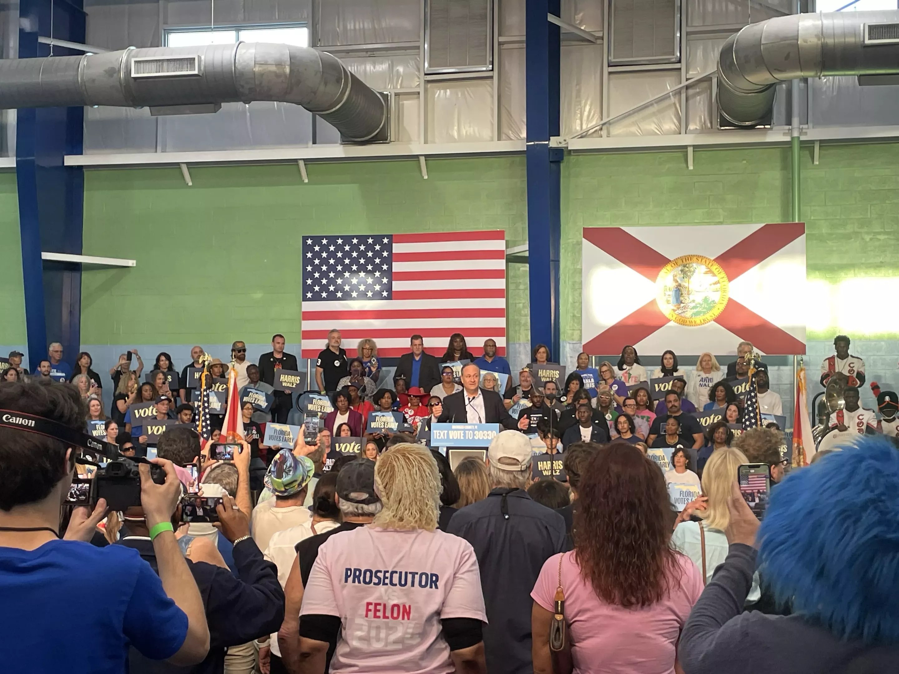 Other themes included Trump’s denigration of women – “Donald Trump, make no mistake, is no friend to women. He has shown himself to be a threat to women. He brags about stripping away Roe v. Wade, followed by a call to pass the statewide initiative to enshrine abortion in the Florida constitution. “Make sure you vote for Amendment 4,” Emhoff declared, sparking chants of “Yes on 4!” from those assembled. (He couldn’t resist an aside regarding the former president’s seeming fixation with Arnold Palmer’s penis: “You hear his references to Arnold Palmer? What is that?”)