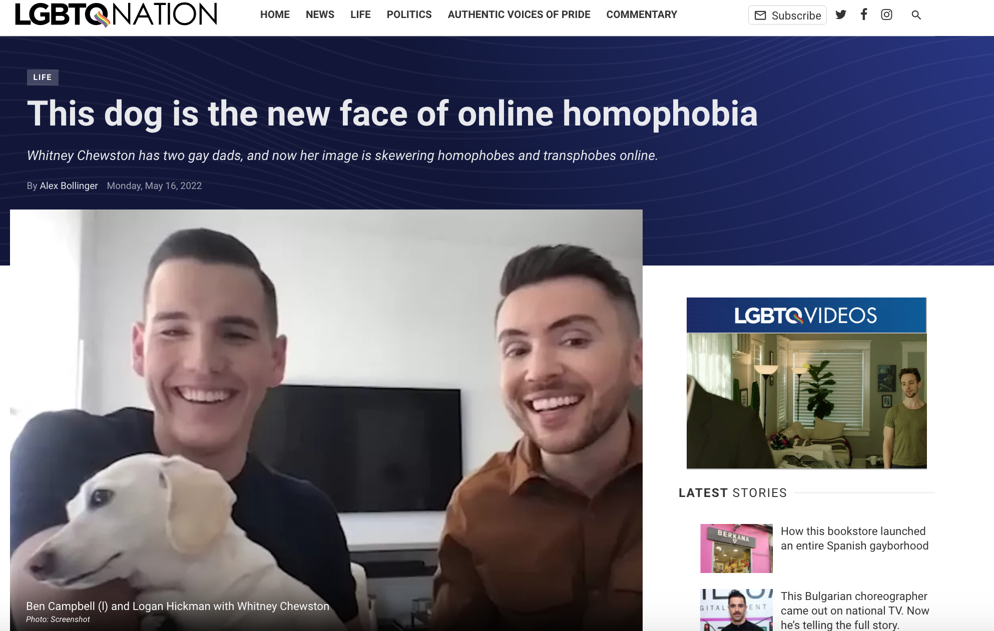 On the same day Pushaw shared the bogus screenshot, the online news magazine LGBTQ Nation published a real story with that same headline, written by the site’s managing editor, Alex Bollinger, about Whitney Chewston and her gay owners, who explained how the meme started after they posted satirical photos on Instagram.