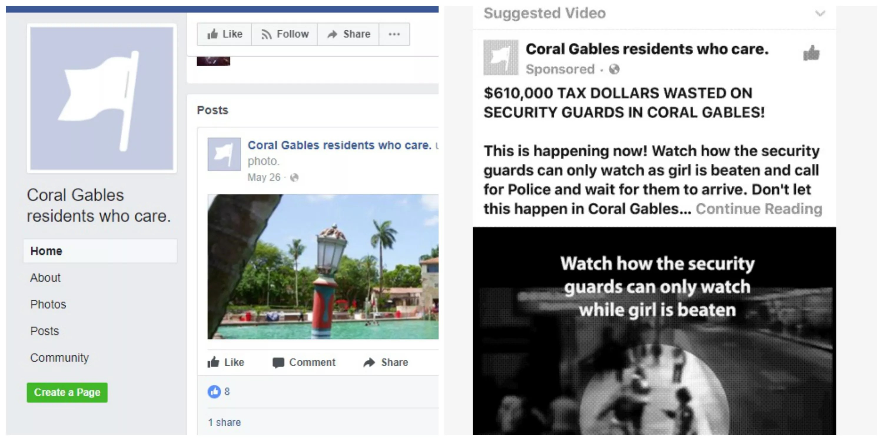 Only traces of the original pages still remain online. After being contacted, Facebook removed a page the city had complained about called “Protect Coral Gables,” although it was soon replaced by one with the even more innocuous name of “Coral Gables Residents Who Care,” which only has nine likes. The city claims Instagram is still circulating an ad from the same poster, but the city’s screenshot shows the ad had just 59 views.