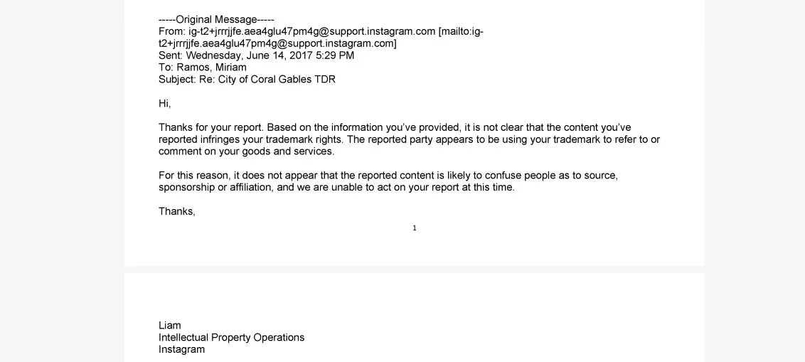 “The reported party appears to be using your trademark to refer to or comment on your goods and services,” the employee wrote in a June 14 email. “For this reason… we are unable to act on your report.”