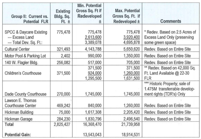 The study also floats the idea of selling “air rights” for developers to build above the existing Miami-Dade Courthouse, for example. The paper also suggests rezoning land set aside for “civic institutions” in order to “maximize property value and achieve the highest economic use.”