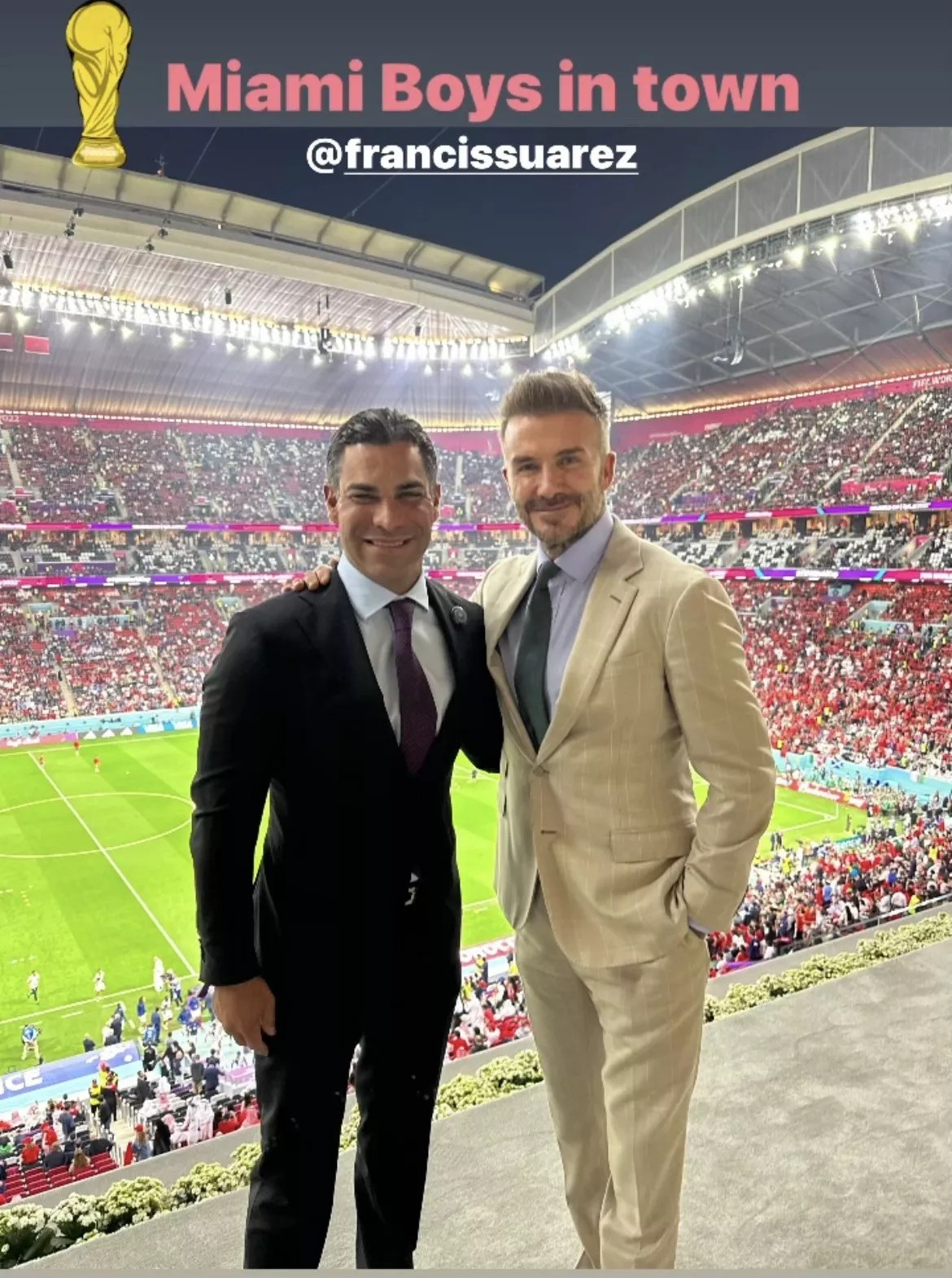 On Instagram, Beckham posted a photo of himself and Suarez (whom he tagged), the pair dressed to the nines with the Al Bayt Stadium stands in the background beneath the caption, “Miami Boys in town.”
