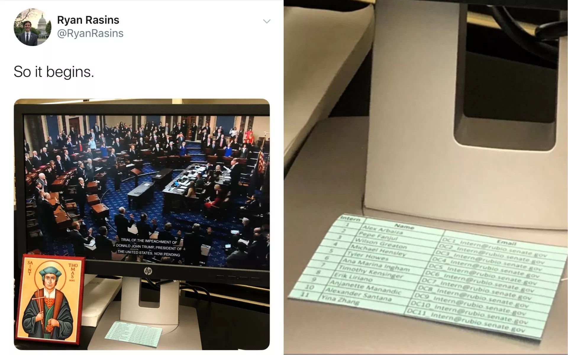 Last week, Rasins posted a photo of his computer monitor as he watched President Donald Trump’s impeachment trial begin in the U.S. Senate chambers. But the photo also captured something else on Rasin’s desk: a printout listing Rubio’s interns. Of the 11 names, the second was Pepe Fanjul. Other interns on the list state online they work for Rubio’s office. New Times messaged the email belonging to Pepe Fanjul – which has an “@rubio.senate.gov” address – but received no response. (The U.S. Senate Disbursement Office told New Times it does not keep records on unpaid interns working with lawmakers.)