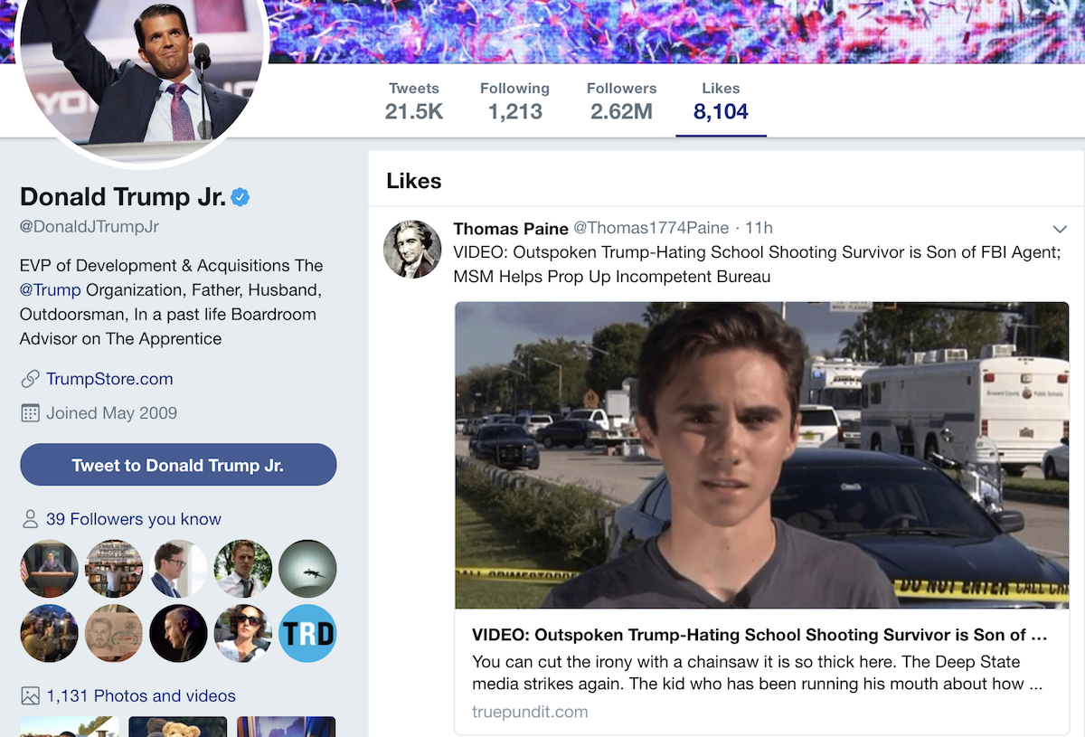 Donald Trump Jr. liked several tweets this morning from True Pundit — a sub-InfoWars conspiracy site known for posting made-up stories — and the similarly fact-challenged Gateway Pundit that slam David Hogg, one of the Parkland students who has made several cable-TV news appearances to plead for greater gun control.