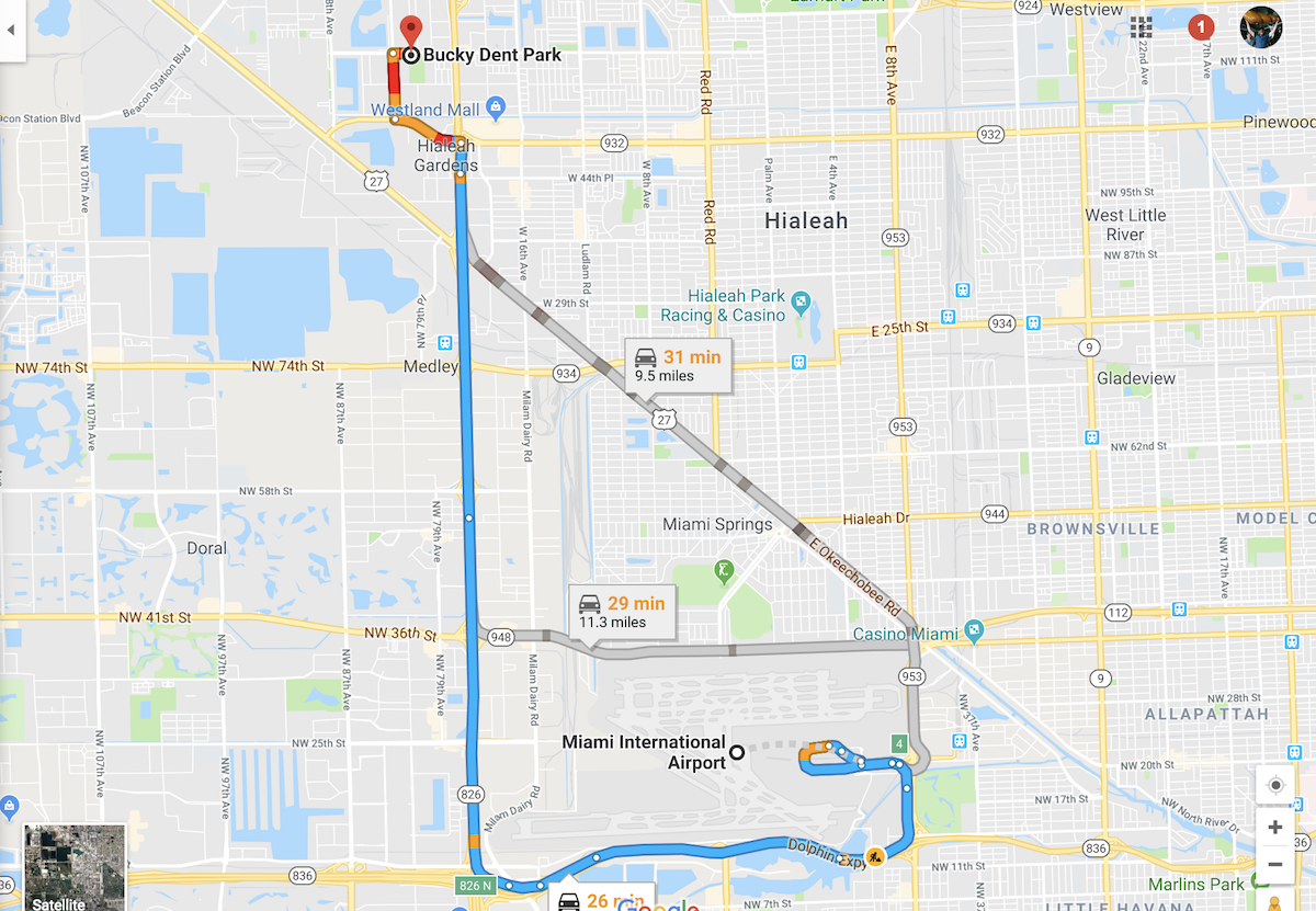 Trump will then head straight from MIA to Bucky Dent Park roughly 12 miles northwest in Hialeah. He’s due to arrive after about a 15-minute drive. (It’s amazing what a Secret Service detail can do for your travel time on Miami’s highways.)