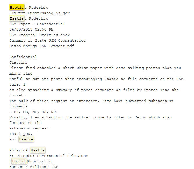 “Please find attached a short white paper with some talking points that you might find useful to cut and paste when encouraging States to file comments on the SSM rule,” Hastie wrote.