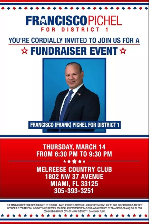 Pichel filed campaign paperwork with the city February 1, according to city records available online. Blogger Al Crespo first published a flyer Pichel is spreading for a recent fundraiser at the Melreese Country Club: