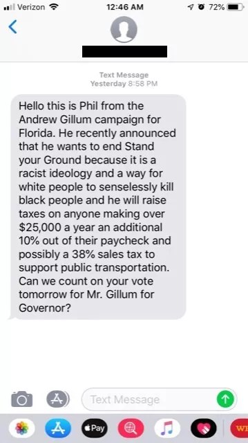 Here is how it read: “Hello this is Phil from the Andrew Gillum campaign for Florida. He recently announced that he wants to end Stand Your Ground because it is a racist ideology and a way for white people to kill black people and he will raise taxes on anyone making over $25,000 per year an additional 10% out of their paycheck and possibly a 38% sales tax to support public transportation. Can we count on your vote tomorrow for Mr. Gillum for Governor?”