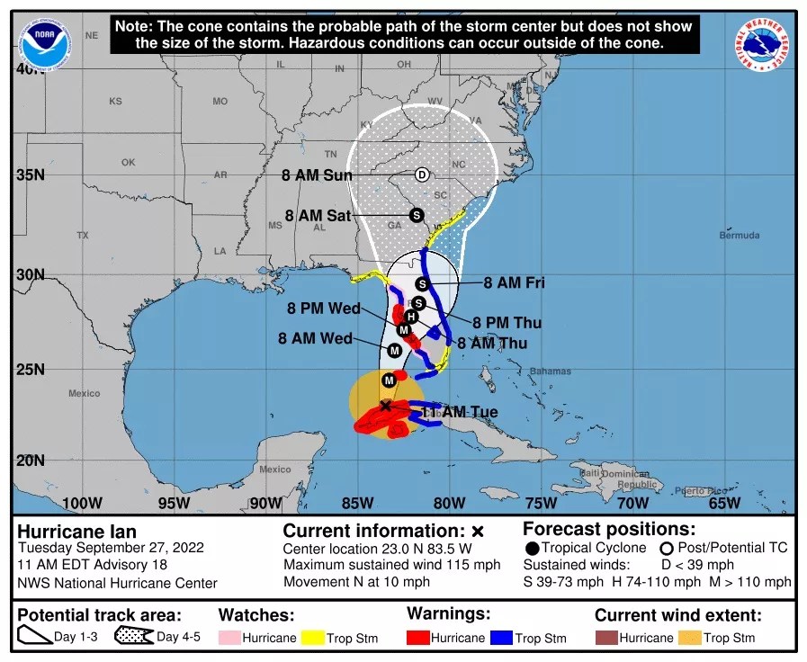 Update published 11:20 a.m. 9/27/2022: Hurricane Ian has strengthened into a major hurricane with sustained wind speeds of 115 mph as of September 27, 11 a.m. The National Hurricane Center warned that Cuba may experience life-threatening storm surge, flash floods, and devastating wind damage as the storm passes over the western portion of the country today.