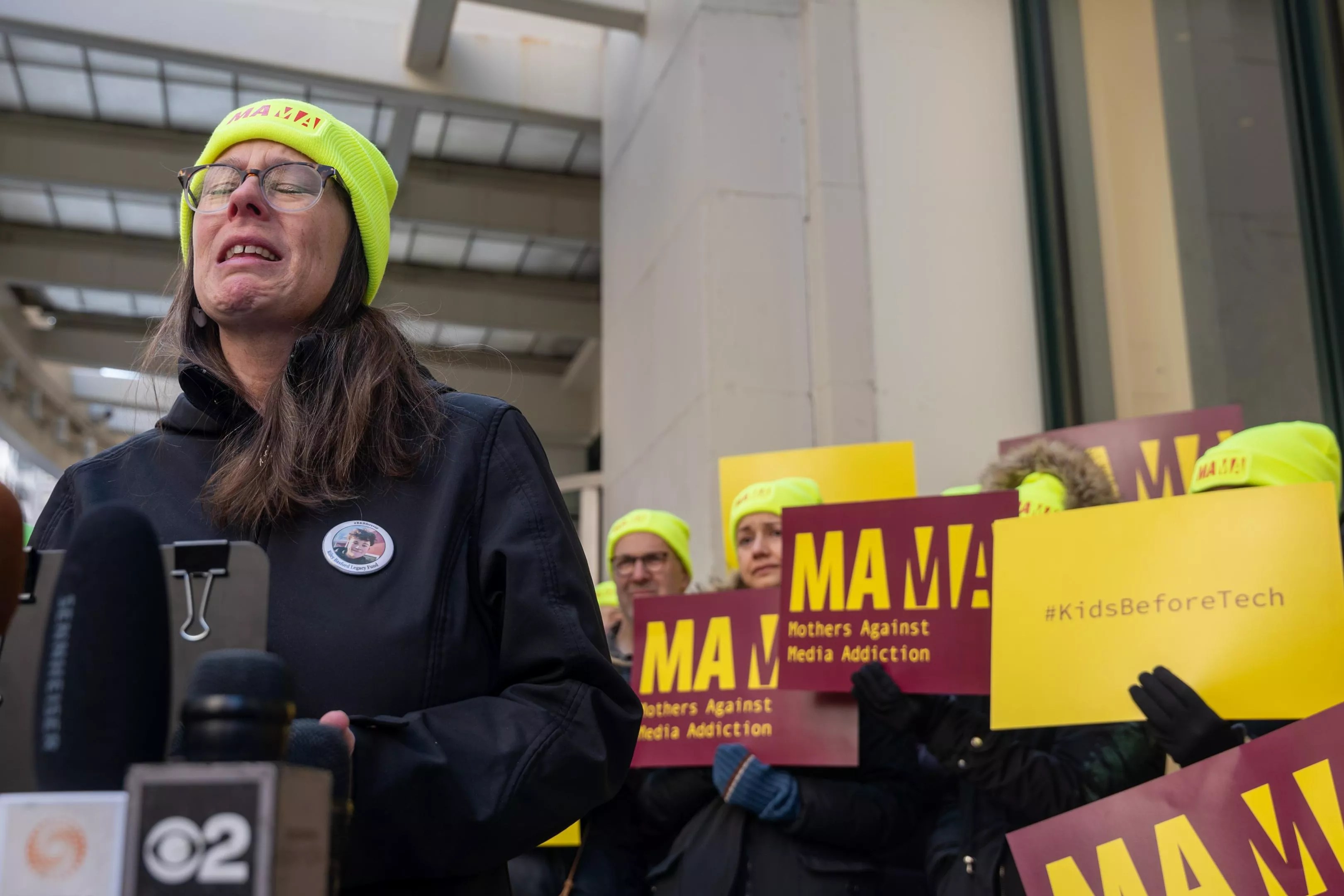 Mary Rodee, whose 15-year-old son Riley died by suicide after being bullied on Facebook, joins other members of Mothers Against Media Addiction (MAMA) at a rally outside of Meta’s New York offices on March 22, 2024 in New York City.