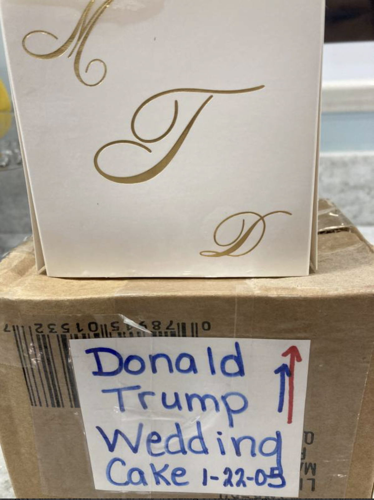 One photo shows what appears to be a cardboard box with a label that reads, “Donald Trump Wedding Cake 1-22-05.”