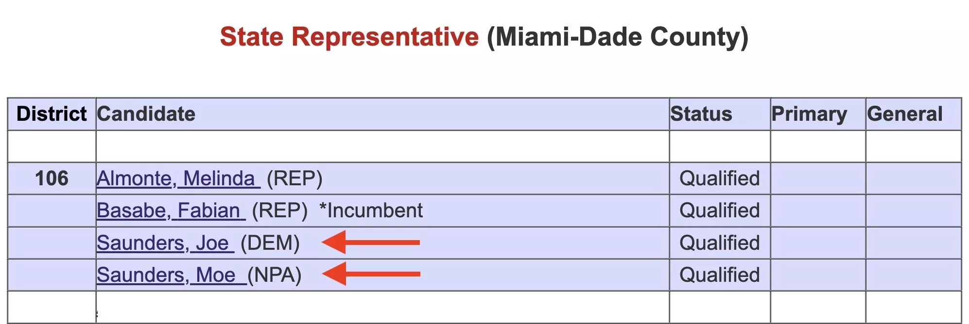 It wasn’t Scott’s address that caught the eye of some Miami Beach residents. It was her name. Why, suddenly, were two people named Saunders vying for the same House seat? the NoBe News Facebook page wanted to know. More to the point: Could this be a case of a latecomer filing for office in an attempt to confuse voters?