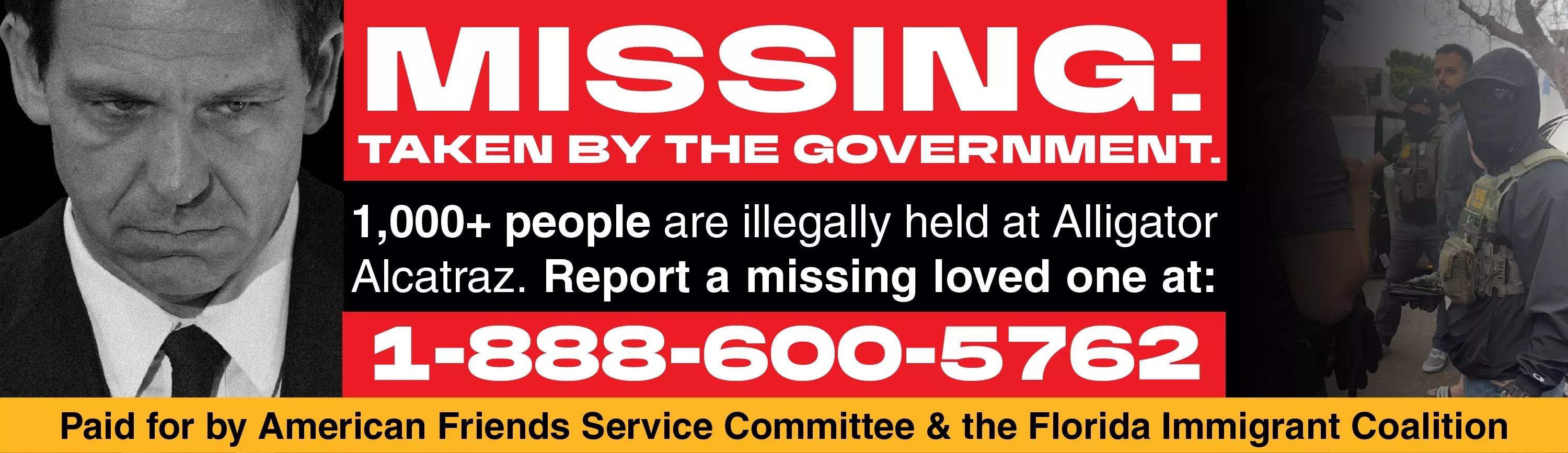 The Florida Immigrant Coalition has launched a new billboard on Interstate 95 and 7th Street accusing authorities of illegally detaining more than 1,000 people at Alligator Alcatraz, the troubled South Florida detention facility. The nonprofit is also promoting its hotline – 888-600-5762 – to collect stories from detained immigrants and connect the community with legal resources, Florida Immigrant Coalition policy analyst Thomas Kennedy tells New Times.
