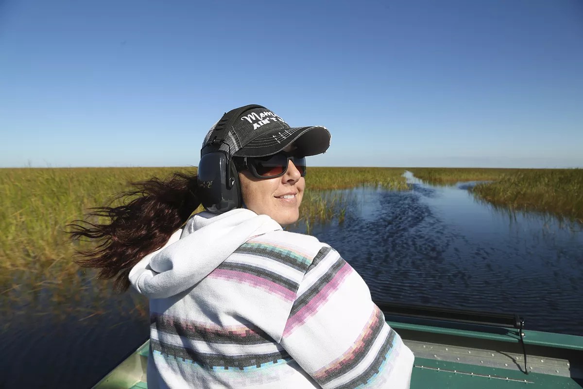 The 26-foot aluminum vessel sets off. Within minutes, it’s skating down a creek banked by razor-edged sawgrass, spatterdock water lilies, and copper-red dragonflies. Though the wet breeze slams against her eyelids, the mother of three from San Francisco sighs contentedly.