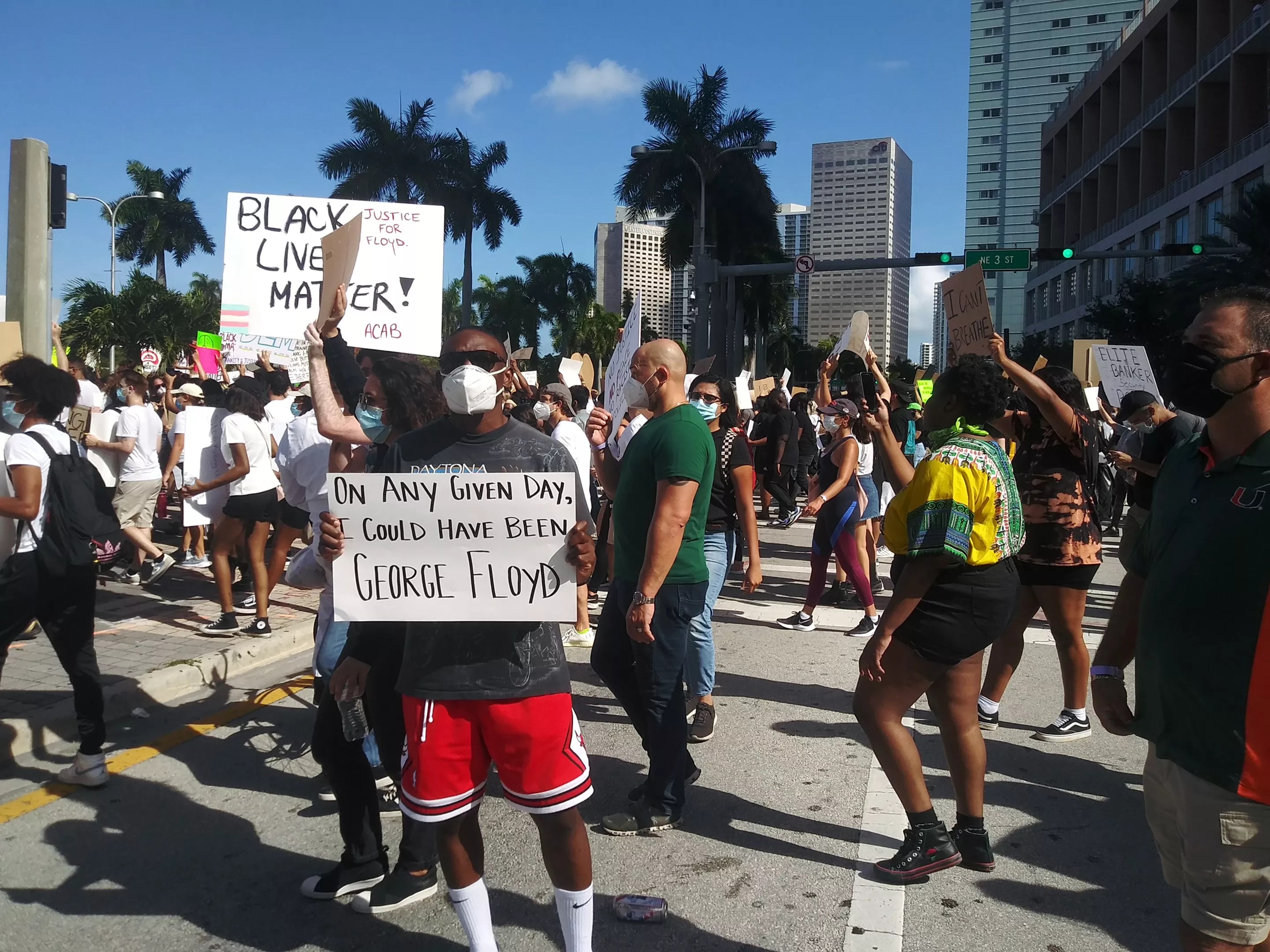 The protesters’ numbers multiplied as they marched down NE Third Street toward Miami Police Department headquarters. The crowd cycled between chanting “black lives matter” and “no justice, no peace, no racist police.” Police officers on bicycles bordered the protest for most of the march, keeping their distance and blocking streets to let the march proceed.