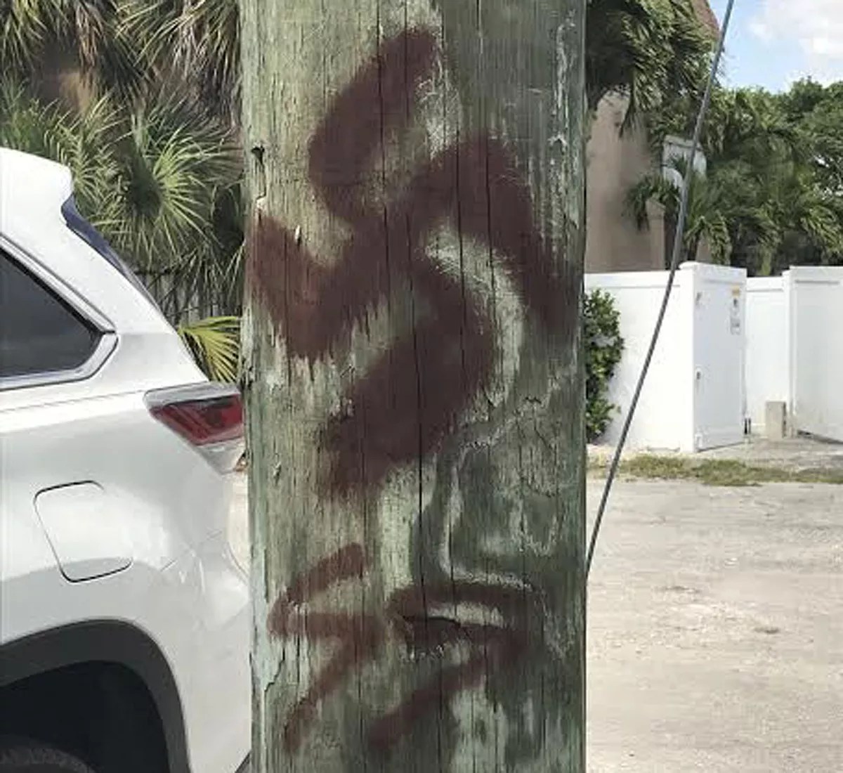 Swastika spray-painted on a telephone pole in Dania Beach are among the bigoted displays captured in ProPublica’s database.