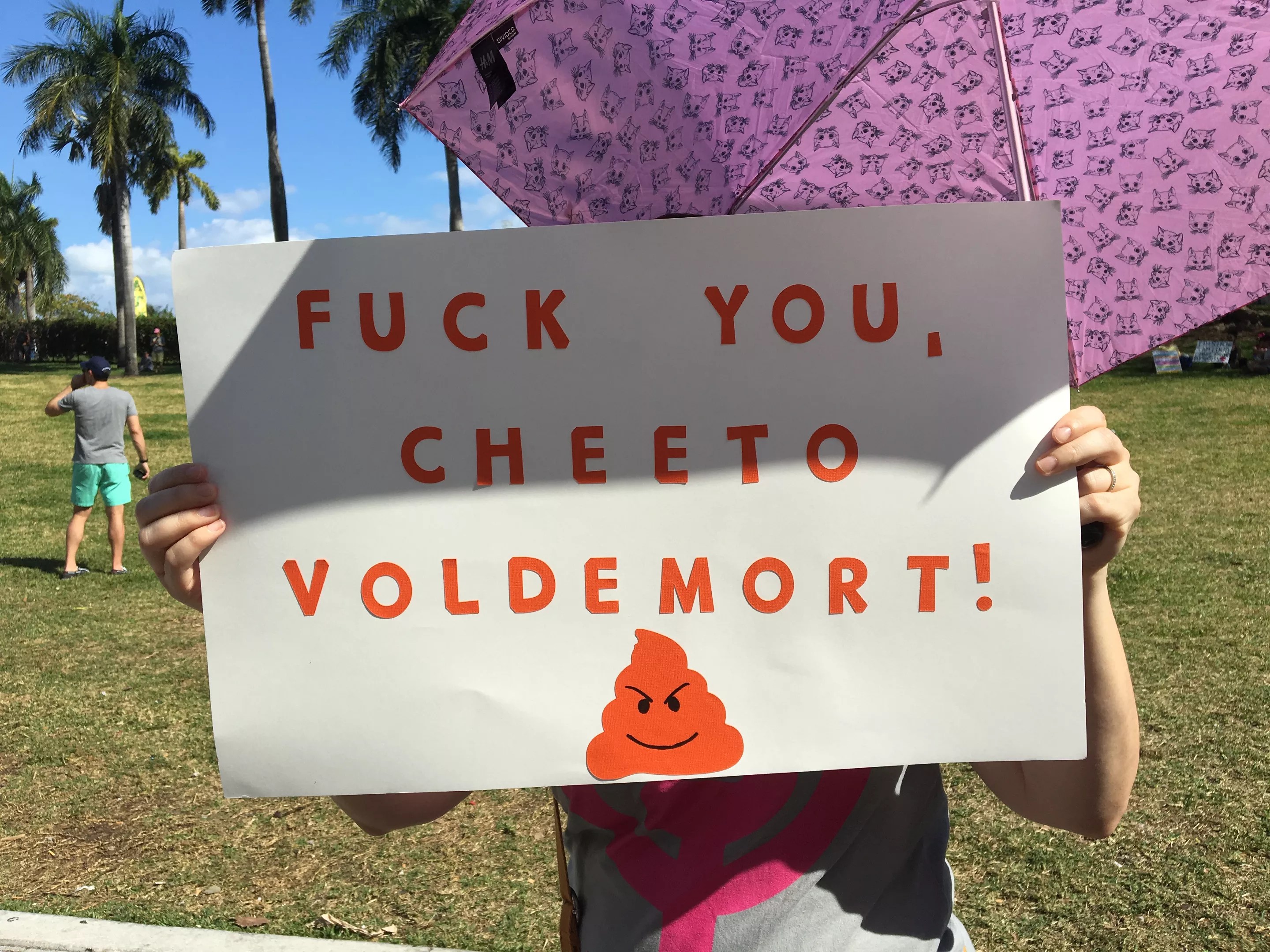 Lots of signs poked fun of the phenomenon that is Trump’s hair.