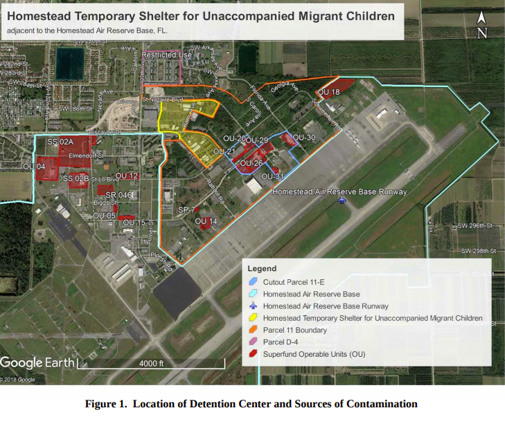 The Shelter is directly adjacent to the Homestead Air Force Base EPA Superfund site (EPA ID FL7570024037). Eight Superfund contaminated areas (called operable units, or OUs) are directly west, east and south of the Shelter. These contaminated OUs were once part of the Homestead Air Force Base and were used for the storage of hazardous materials, including munitions and industrial waste, and for aircraft maintenance, testing, and disposal. The EPA reports that “additional measures are needed for long-term protectiveness from direct exposure” and that these OUs are “located in an unpopulated area, with no residences located on the site or nearby.” These sites are in fact directly adjacent to a residential facility for migrant children.