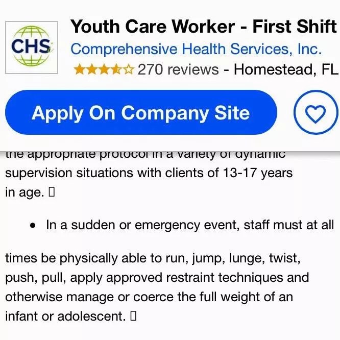 To get a job as a youth care worker at the Homestead facility for migrant children, applicants must be at least 21 years old, have a high school diploma, and pass a background check. Candidates also need to be bilingual and able to supervise children. And – in a detail that troubles advocates – they have to be physically able to restrain or coerce kids.